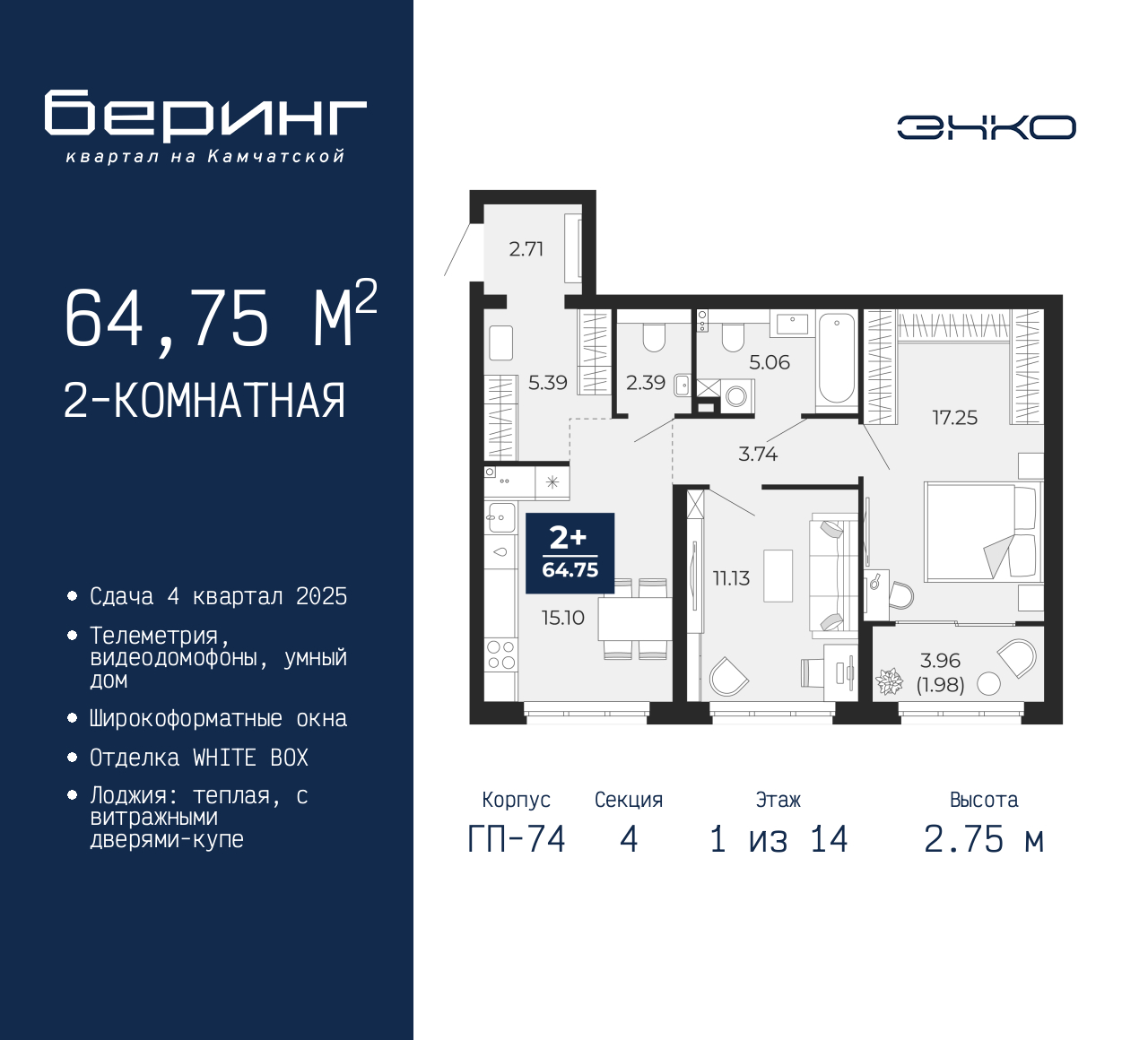 2-комн. квартира в ЖК "Беринг" на 1 этаже. Квартира без отделки, полностью готова к чистовой отделке и дальнейшему ремонту. Общая площадь: 64.75 кв.м., жилая: 28.38 кв.м., площадь просторной кухни-столовой: 15.1 кв.м. Комнаты изолированные, все окна выходят на одну сторону. В квартире одна лоджия, один совмещенный и один раздельный санузел. Высота потолков 2.75 м. Дом монолитный, многоподъездный, переменной этажности, от 9 до 21 этажей. Квартира находится в 4-й секции высотой 14 этажей в корпусе ГП-74. На этаже 7 квартир. В подъезде 1 пассажирский и 1 грузовой лифт. Окончание строительства - 4 квартал 2025 года. Оформление сделки по договору долевого участия. Подобно знаменитому исследователю, мы чувствуем себя первооткрывателями этой локации. Хотим показать новую суть места, сформировать для вас жизненный опыт, которого ещё не было. Беринг — район зелёного цвета. Беринг — район, который откроется вам с другой стороны. Впечатлит новым уровнем комфорта и качеством жизни. Беринг — открытие на карте города. Первый квартал расположен в районе Тура, в границах улиц: Камчатская – Западносибирская – Энтузиастов. Вокруг уже есть всё для того, чтобы ежедневная рутина была лишь частью жизни и не доставляла дискомфорта. Школы и детские сады, магазины и аптеки, поликлиника, места для семейного отдыха, пеших и велопрогулок, и даже рыбалки. Масштабное озеленение дворов — визитная карточка ЭНКО и ваш оазис спокойствия, чтобы отвлечься от повседневности. Раскидистые деревья, кустарники, травы и цветы — осталось остановиться, вдохнуть и расслабиться, глядя на эту природную красоту. Стилистика подъездов продолжает концепцию Беринга, вдохновлённого Камчаткой: сдержанный, но при этом впечатляющий дизайн соседствует с удобством и функциональностью. (AQID02316159)