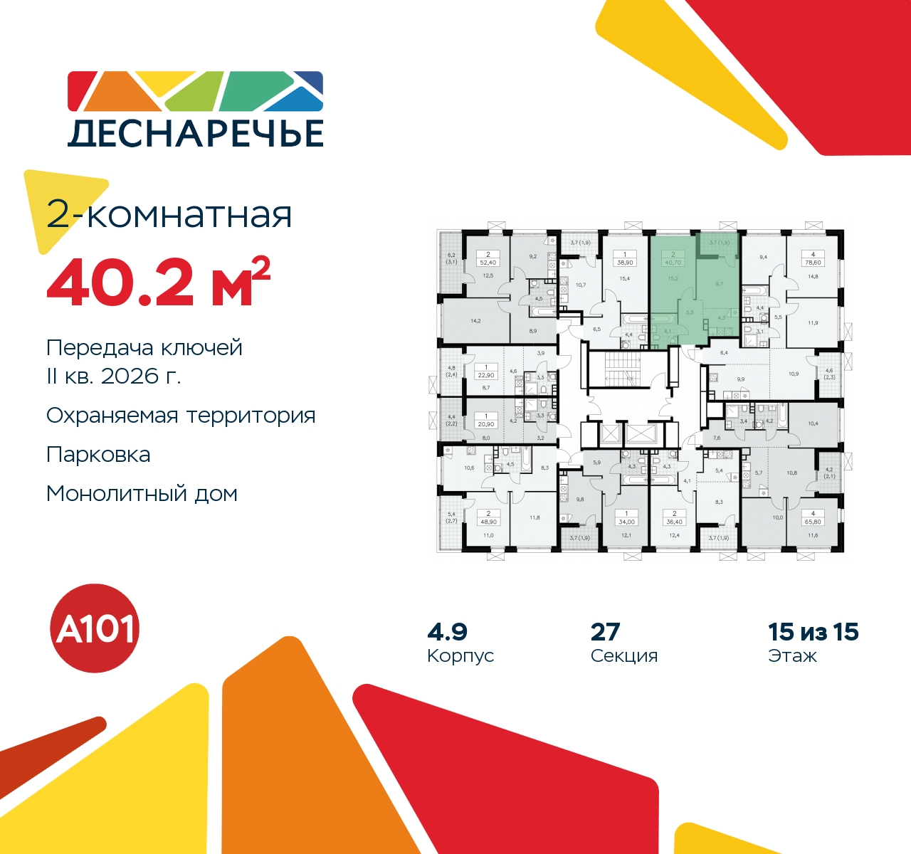 Продается двухкомнатная квартира с европланировкой и отделкой в ЖК "Деснаречье" на 15 этаже. Общая площадь: 40.2 кв.м., жилая: 24.9 кв.м., общая площадь гостиной-столовой с кухонной зоной: 14 кв.м. Европланировка, кухня-гостиная - идеальный вариант для тех, кто любит часто принимать гостей. Комнаты изолированные, все окна выходят на одну сторону. В квартире одна лоджия, один совмещенный санузел. Высота потолков 2.95 м. Эта квартира будет сдана с дизайнеркой отделкой "под ключ". Специально для вас мы разработали несколько решений дизайнерской отделки. В отделке используются только современный высококлассные материалы, на все работы предоставляется гарантия. В таком случае вы оплачиваете отделку в сегодняшних ценах, а эту стоимость вы можете разнести в ипотечных платежах. Квартира находится в корпусе 4.9. Дом монолитный, одноподъездный, высотой 15 этажей. На этаже 10 квартир. В подъезде 1 пассажирский и 1 грузовой лифт. Начало строительства - 3 квартал 2023 года. Окончание строительства - 2 квартал 2026 года. Оформление сделки по договору долевого участия. Артикул квартиры по базе застройщика 88К-4.9-2142. ПРЕДЛОЖЕНИЯ ОТ ЗАСТРОЙЩИКА В ОКТЯБРЕ 2025: Ипотека от 13,9 % для всех! На весь срок. "Семейная ипотека" вернулась. Ставка от 3,5 % на весь срок! Без удорожания! Выгодное ипотечное комбо: Ипотека от 2200 р./мес. и от 6 % после рождения ребёнка! Ипотека для всех "Держи пять!" - ставка 5 % на 2 года! *более подробную информацию по скидкам и акциям уточняйте в отделе продаж Масштабный проект "Деснаречье" на юго-западе Москвы, который включает три новых района («квартала»), объединённые общей идеей – воплотить в реальность мечты современных жителей столицы об интересном, комфортном и разноплановом городском пространстве в окружении рек и лесов, словно сошедших с полотен русских живописцев: - «Берег» оценят все, кому близка водная стихия: плеск волн, солнечные блики и прогулки вдоль тихого течения речи. - «Лес» утопает в зелени парков и лесов. Здесь соблюдён идеальный баланс загородного спокойствия и столичного комфорта. - «Парк», самый энергичный и яркий, отличается высокой концентрацией пространств для спорта и творчества. Жилой комплекс "Деснаречье" расположится в 12 км от МКАД по современному Калужскому шоссе. Внешний облик зданий соответствует современному стилю и стандартам, характерным и для других популярных проектов ГК «А101»: сочетание контрастных тонов, большое количество остекления, в котором отражается небо, гармония с природным окружением. Весь город - в вашем районе. Находиться на территории «15-минутного города» значит иметь всё необходимое для полноценной жизни в шаговой доступности. Маршруты в районе «Деснаречье» выстроены так, чтобы добраться до магазинов, парков, школ, салонов услуг и других объектов можно было всего за несколько минут пешком или на велосипеде. Двор закрытый от машин – это тишина, комфорт и безопасность, поэтому все машино-места (включая «семейные» и увеличенные, с возможностью установки роллетных шкафов) находятся в подземном паркинге. В паркинги можно спуститься на лифте из любого подъезда или по лестнице. Рядом с «Деснаречьем» в 2027 году планируется открытие станции метро «Десна», до которой будет удобно добраться пешком или на велосипеде. Дорога на автомобиле до перехватывающих парковок станций «Ольховая» и «Прокшино» займёт около 10 ми
