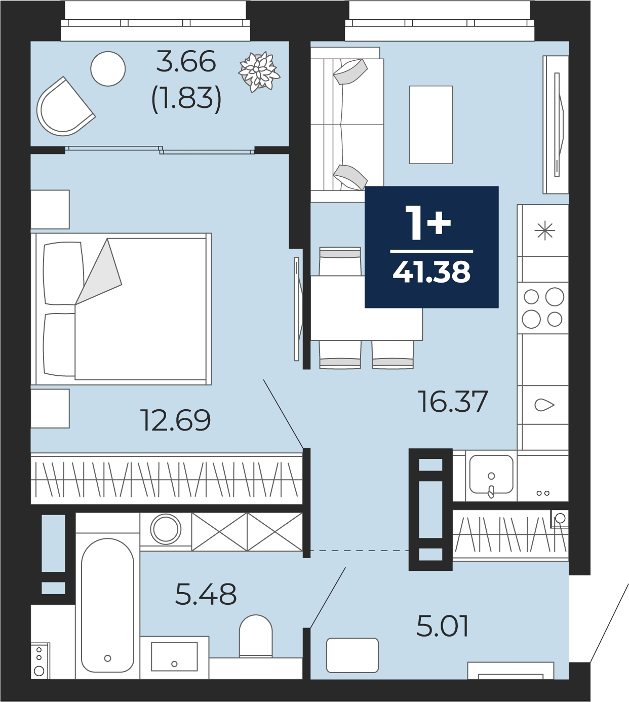 - Общая площадь 41.38 м²