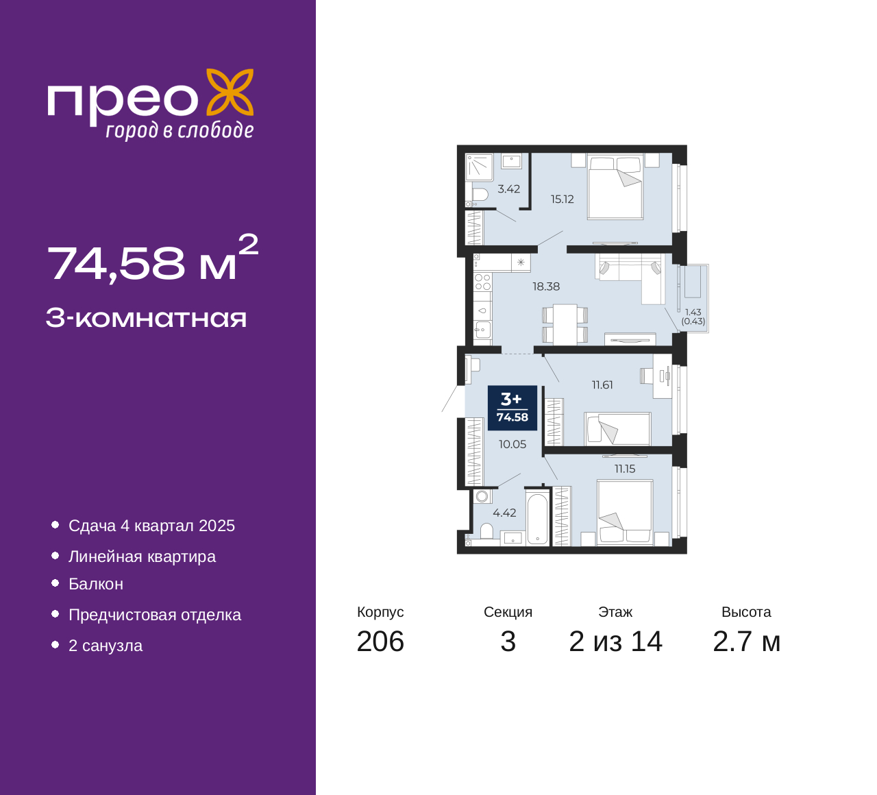 Трехкомнатная квартира от застройщика с предчистовой отделкой в ЖК "Прео" на 2 этаже. Общая площадь: 74.58 кв.м., жилая: 37.88 кв.м., площадь просторной кухни-столовой: 18.38 кв.м. Комнаты изолированные, все окна выходят на одну сторону. В квартире один балкон, два совмещенных санузла. Высота потолков 2.7 м. Дом монолитный, трехподъездный, переменной этажности, от 14 до 23 этажей. Квартира находится в 3-й секции высотой 14 этажей в корпусе 206. На этаже 6 квартир. В подъезде 1 пассажирский и 1 грузовой лифт. Окончание строительства - 4 квартал 2025 года. Оформление сделки по договору долевого участия. Преображенский — один из самых привлекательных районов для жизни! Это полностью самостоятельный жилой район с точки зрения инфраструктуры. Преображенский находится между Московским и Червишевским трактами в квартале улиц Закалужская — Вьюжная — Александра Протозанова. Не нужно ждать, когда появится инфраструктура — переезжайте на всё готовое. Вблизи расположены действующие школа и детский сад. В этом году откроется еще один сад, а в следующем году — школа. По соседству с Преображенским запланировано строительство городского парка «Комарово» площадью 38 гектар. За 10 минут можно доехать на автомобиле до крупных ТРЦ: «Лента», «Кристалл», «Леруа Мерлен», «Метро» и «Ашан». С 2018 года в районе открыт Соседский центр — пространство, созданное для формирования добрососедской среды, совместного досуга, общения и реализации соседских инициатив. Здесь проходят встречи соседей, а также сами жители района организовывают мероприятия. Организатором такого события может стать любой желающий. В квартирах выполнена качественная предчистовая отделка. Гладкие стены с финишным выравниванием по маякам. Ровный потолок для установки натяжного потолка. Установлены пятикамерные окна с двойным стеклопакетом (3 стекла). Дизайнерские холлы с видеонаблюдением, безбарьерным и прозрачным входом – всегда светло и спокойно. На первом этаже есть просторные колясочные, где все жители могут оставлять свои коляски и велосипеды. В Преображенском есть всё, что нужно для активного отдыха и занятий спортом. Мы сделали большое футбольное поле с безопасным покрытием. Также установили хоккейный корт, который оборудован по всем необходимым стандартам. Во дворах можно делать упражнения на специальных площадках с турниками. Весь район мы обустроили велодорожками, которые связаны в единый маршрут. У нас есть сухие фонтаны, бьющие из земли, деревья, веревки, сетки, скалодром, газон, песок и резинка — осталось просто дать своему ребенку право на свободную игру. По-настоящему хорошие дворы — это те, которые дети предпочитают соцсетям и телевизору. Аккредитация в банках: ПАО «Газпромбанк», «Сбербанк России», ПАО Банк «ВТБ», ОАО «Альфа-Банк», ПАО «Банк Уралсиб» и других. (AQID02356032)