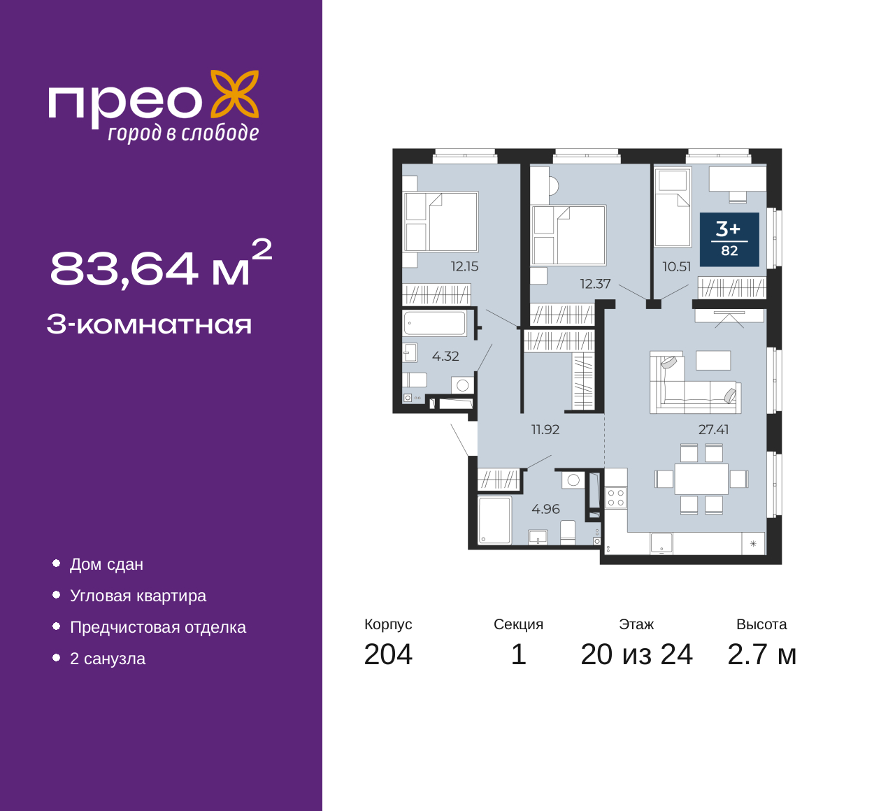 Просторная 3-комн. квартира с предчистовой отделкой в ЖК "Прео" на 20 этаже. Общая площадь: 83.64 кв.м., жилая: 35.03 кв.м., площадь просторной кухни-столовой: 27.41 кв.м. Квартира угловая, идеально подойдет любителям тишины и панорамных видов. В квартире два совмещенных санузла. Высота потолков 2.7 м. Квартира находится в корпусе 204. Дом монолитный, одноподъездный, высотой 24 этажа. На этаже 14 квартир. В подъезде 2 грузовых лифта. Строительство окончено, дом сдан в 4 квартале 2024 года. Оформление сделки по договору купли-продажи. Преображенский — один из самых привлекательных районов для жизни! Это полностью самостоятельный жилой район с точки зрения инфраструктуры. Преображенский находится между Московским и Червишевским трактами в квартале улиц Закалужская — Вьюжная — Александра Протозанова. Не нужно ждать, когда появится инфраструктура — переезжайте на всё готовое. Вблизи расположены действующие школа и детский сад. В этом году откроется еще один сад, а в следующем году — школа. По соседству с Преображенским запланировано строительство городского парка «Комарово» площадью 38 гектар. За 10 минут можно доехать на автомобиле до крупных ТРЦ: «Лента», «Кристалл», «Леруа Мерлен», «Метро» и «Ашан». С 2018 года в районе открыт Соседский центр — пространство, созданное для формирования добрососедской среды, совместного досуга, общения и реализации соседских инициатив. Здесь проходят встречи соседей, а также сами жители района организовывают мероприятия. Организатором такого события может стать любой желающий. В квартирах выполнена качественная предчистовая отделка. Гладкие стены с финишным выравниванием по маякам. Ровный потолок для установки натяжного потолка. Установлены пятикамерные окна с двойным стеклопакетом (3 стекла). Дизайнерские холлы с видеонаблюдением, безбарьерным и прозрачным входом – всегда светло и спокойно. На первом этаже есть просторные колясочные, где все жители могут оставлять свои коляски и велосипеды. В Преображенском есть всё, что нужно для активного отдыха и занятий спортом. Мы сделали большое футбольное поле с безопасным покрытием. Также установили хоккейный корт, который оборудован по всем необходимым стандартам. Во дворах можно делать упражнения на специальных площадках с турниками. Весь район мы обустроили велодорожками, которые связаны в единый маршрут. У нас есть сухие фонтаны, бьющие из земли, деревья, веревки, сетки, скалодром, газон, песок и резинка — осталось просто дать своему ребенку право на свободную игру. По-настоящему хорошие дворы — это те, которые дети предпочитают соцсетям и телевизору. Аккредитация в банках: ПАО Банк «ВТБ», «Сбербанк России», ПАО «Газпромбанк», ПАО «Банк Уралсиб», ОАО «Альфа-Банк» и других. (AQID02278634)