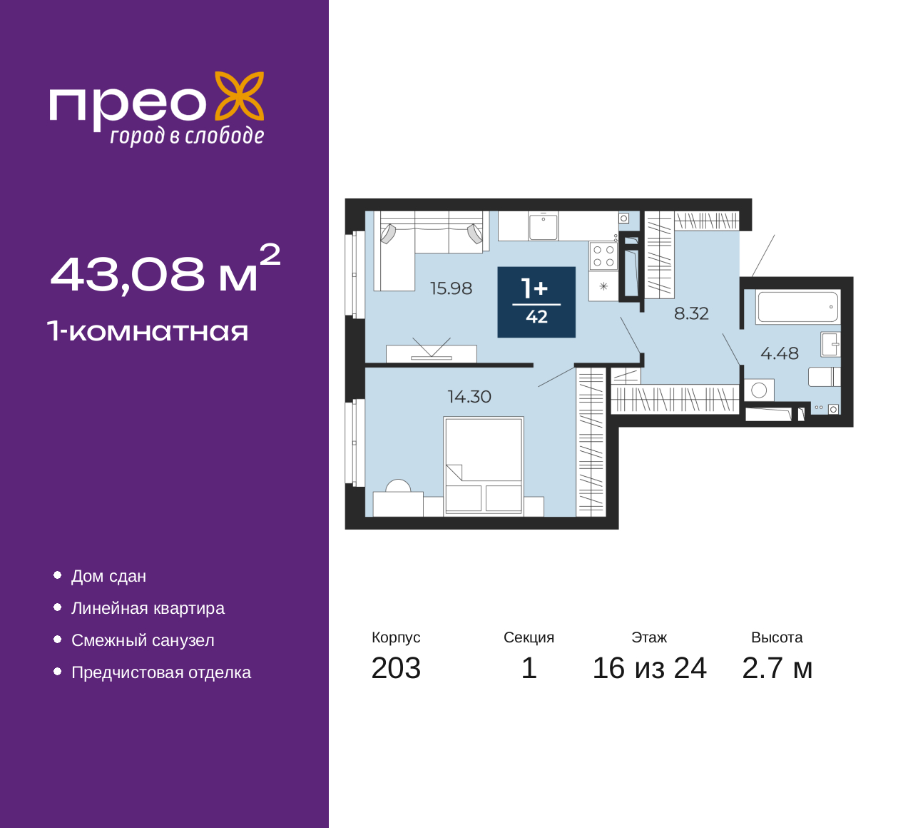- Общая площадь 43.08 м²