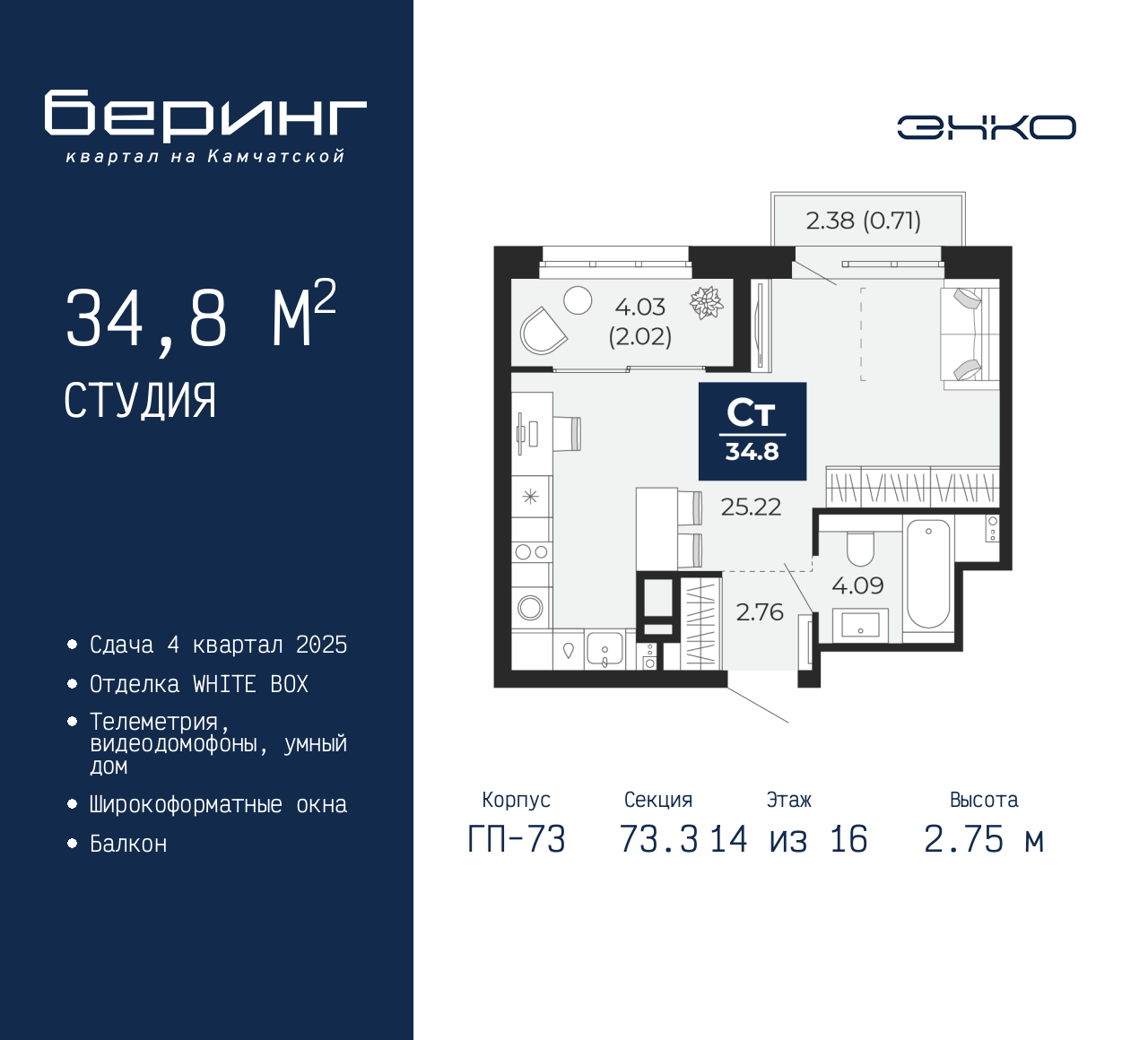 Просторная однокомнатная квартира-студия в ЖК "Беринг" на 14 этаже. Квартира без отделки, полностью готова к чистовой отделке и дальнейшему ремонту. Общая площадь: 34.8 кв.м., площадь гостиной 25.22 кв.м., из которых 5 кв.м. выделено под кухонную зону. Все окна выходят на одну сторону. В квартире один балкон, один совмещенный санузел. Высота потолков 2.75 м. Дом монолитный, многоподъездный, переменной этажности, от 9 до 22 этажей. Квартира находится в 73.3-й секции высотой 16 этажей в корпусе ГП-73. На этаже 8 квартир. В подъезде 1 пассажирский и 1 грузовой лифт. Окончание строительства - 4 квартал 2025 года. Оформление сделки по договору долевого участия. Подобно знаменитому исследователю, мы чувствуем себя первооткрывателями этой локации. Хотим показать новую суть места, сформировать для вас жизненный опыт, которого ещё не было. Беринг — район зелёного цвета. Беринг — район, который откроется вам с другой стороны. Впечатлит новым уровнем комфорта и качеством жизни. Беринг — открытие на карте города. Первый квартал расположен в районе Тура, в границах улиц: Камчатская – Западносибирская – Энтузиастов. Вокруг уже есть всё для того, чтобы ежедневная рутина была лишь частью жизни и не доставляла дискомфорта. Школы и детские сады, магазины и аптеки, поликлиника, места для семейного отдыха, пеших и велопрогулок, и даже рыбалки. Масштабное озеленение дворов — визитная карточка ЭНКО и ваш оазис спокойствия, чтобы отвлечься от повседневности. Раскидистые деревья, кустарники, травы и цветы — осталось остановиться, вдохнуть и расслабиться, глядя на эту природную красоту. Стилистика подъездов продолжает концепцию Беринга, вдохновлённого Камчаткой: сдержанный, но при этом впечатляющий дизайн соседствует с удобством и функциональностью. (AQID02315552)