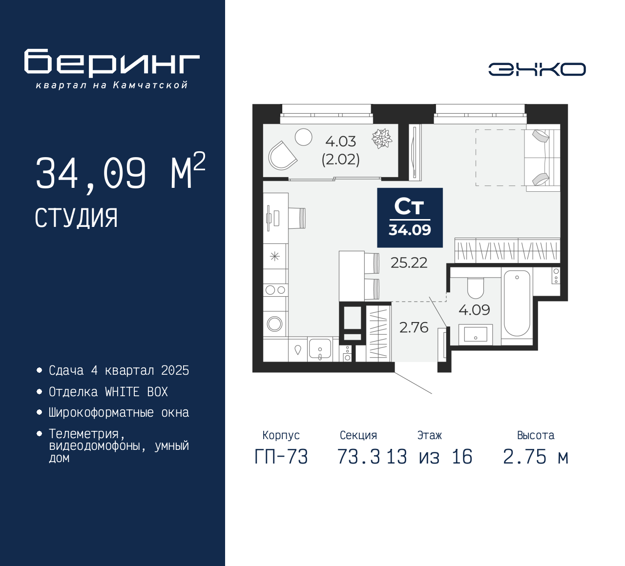 Просторная однокомнатная квартира-студия в ЖК "Беринг" на 13 этаже. Квартира без отделки, полностью готова к ремонту. Общая площадь: 34.09 кв.м., площадь гостиной 25.22 кв.м., из которых 5 кв.м. выделено под кухонную зону. Все окна выходят на одну сторону. В квартире один совмещенный санузел. Высота потолков 2.75 м. Дом монолитный, многоподъездный, переменной этажности, от 9 до 22 этажей. Квартира находится в 73.3-й секции высотой 16 этажей в корпусе ГП-73. На этаже 8 квартир. В подъезде 1 пассажирский и 1 грузовой лифт. Окончание строительства - 4 квартал 2025 года. Оформление сделки по договору долевого участия. Подобно знаменитому исследователю, мы чувствуем себя первооткрывателями этой локации. Хотим показать новую суть места, сформировать для вас жизненный опыт, которого ещё не было. Беринг — район зелёного цвета. Беринг — район, который откроется вам с другой стороны. Впечатлит новым уровнем комфорта и качеством жизни. Беринг — открытие на карте города. Первый квартал расположен в районе Тура, в границах улиц: Камчатская – Западносибирская – Энтузиастов. Вокруг уже есть всё для того, чтобы ежедневная рутина была лишь частью жизни и не доставляла дискомфорта. Школы и детские сады, магазины и аптеки, поликлиника, места для семейного отдыха, пеших и велопрогулок, и даже рыбалки. Масштабное озеленение дворов — визитная карточка ЭНКО и ваш оазис спокойствия, чтобы отвлечься от повседневности. Раскидистые деревья, кустарники, травы и цветы — осталось остановиться, вдохнуть и расслабиться, глядя на эту природную красоту. Стилистика подъездов продолжает концепцию Беринга, вдохновлённого Камчаткой: сдержанный, но при этом впечатляющий дизайн соседствует с удобством и функциональностью. (AQID02315553)