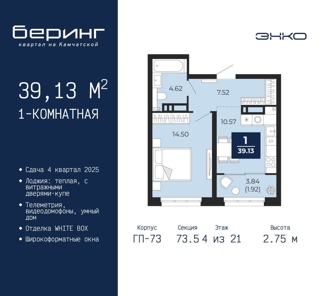 Продается 1-комн. квартира в ЖК "Беринг" на 4 этаже. Квартира без отделки, новый собственник может сделать ремонт по своему проекту. Общая площадь: 39.13 кв.м., жилая: 14.5 кв.м., площадь просторной кухни-столовой: 10.57 кв.м. Все окна выходят на одну сторону. В квартире одна лоджия, один совмещенный санузел. Высота потолков 2.75 м. Дом монолитный, многоподъездный, переменной этажности, от 9 до 22 этажей. Квартира находится в 73.5-й секции высотой 21 этаж в корпусе ГП-73. На этаже 6 квартир. В подъезде 1 пассажирский и 1 грузовой лифт. Окончание строительства - 4 квартал 2025 года. Оформление сделки по договору долевого участия. Подобно знаменитому исследователю, мы чувствуем себя первооткрывателями этой локации. Хотим показать новую суть места, сформировать для вас жизненный опыт, которого ещё не было. Беринг — район зелёного цвета. Беринг — район, который откроется вам с другой стороны. Впечатлит новым уровнем комфорта и качеством жизни. Беринг — открытие на карте города. Первый квартал расположен в районе Тура, в границах улиц: Камчатская – Западносибирская – Энтузиастов. Вокруг уже есть всё для того, чтобы ежедневная рутина была лишь частью жизни и не доставляла дискомфорта. Школы и детские сады, магазины и аптеки, поликлиника, места для семейного отдыха, пеших и велопрогулок, и даже рыбалки. Масштабное озеленение дворов — визитная карточка ЭНКО и ваш оазис спокойствия, чтобы отвлечься от повседневности. Раскидистые деревья, кустарники, травы и цветы — осталось остановиться, вдохнуть и расслабиться, глядя на эту природную красоту. Стилистика подъездов продолжает концепцию Беринга, вдохновлённого Камчаткой: сдержанный, но при этом впечатляющий дизайн соседствует с удобством и функциональностью. (AQID02315658)