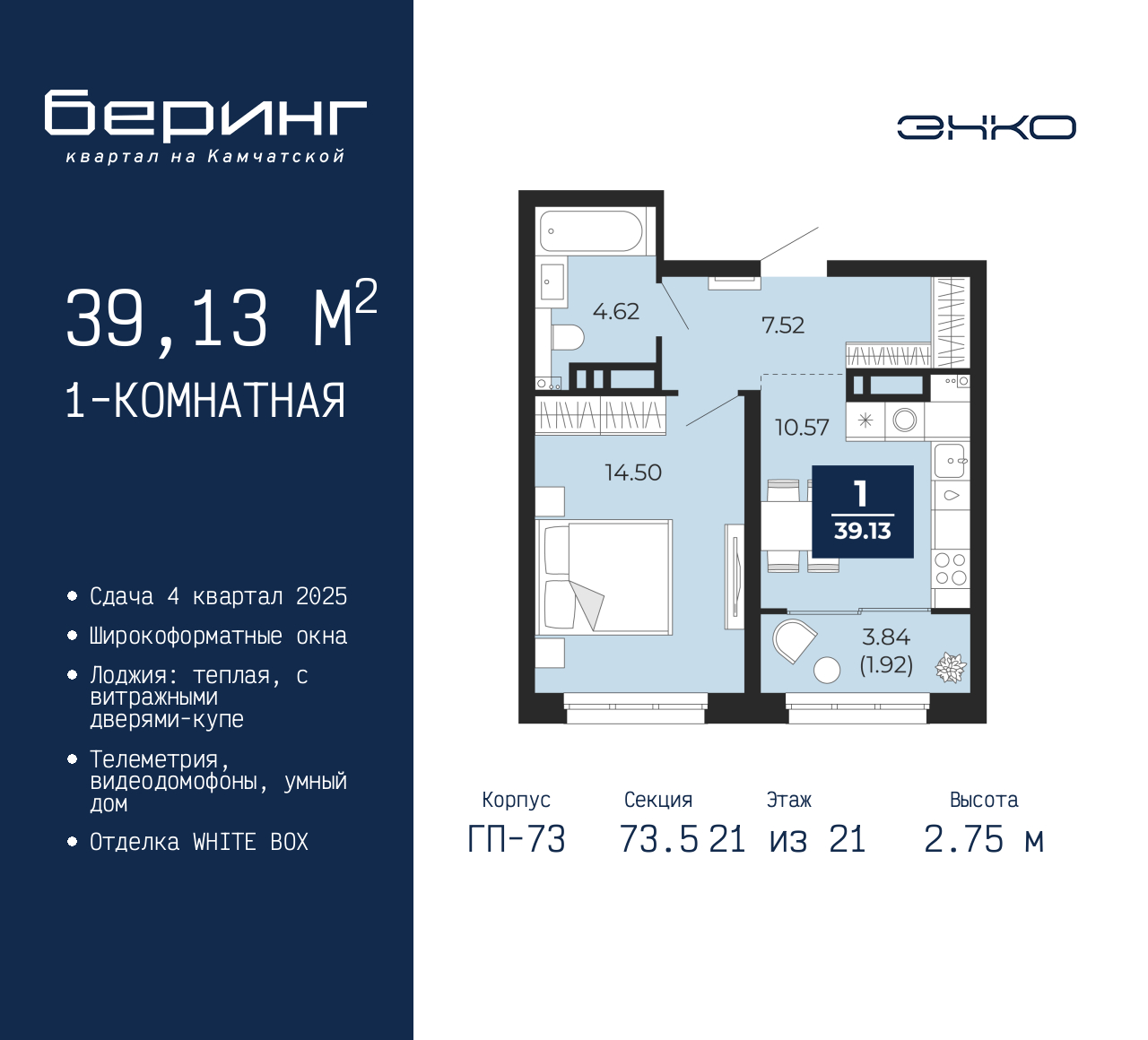 Продается 1-комн. квартира в ЖК "Беринг" на 21 этаже. Квартира без отделки, полностью готова к ремонту. Общая площадь: 39.13 кв.м., жилая: 14.5 кв.м., площадь просторной кухни-столовой: 10.57 кв.м. Все окна выходят на одну сторону. В квартире одна лоджия, один совмещенный санузел. Высота потолков 2.75 м. Дом монолитный, многоподъездный, переменной этажности, от 9 до 22 этажей. Квартира находится в 73.5-й секции высотой 21 этаж в корпусе ГП-73. На этаже 6 квартир. В подъезде 1 пассажирский и 1 грузовой лифт. Окончание строительства - 4 квартал 2025 года. Оформление сделки по договору долевого участия. Подобно знаменитому исследователю, мы чувствуем себя первооткрывателями этой локации. Хотим показать новую суть места, сформировать для вас жизненный опыт, которого ещё не было. Беринг — район зелёного цвета. Беринг — район, который откроется вам с другой стороны. Впечатлит новым уровнем комфорта и качеством жизни. Беринг — открытие на карте города. Первый квартал расположен в районе Тура, в границах улиц: Камчатская – Западносибирская – Энтузиастов. Вокруг уже есть всё для того, чтобы ежедневная рутина была лишь частью жизни и не доставляла дискомфорта. Школы и детские сады, магазины и аптеки, поликлиника, места для семейного отдыха, пеших и велопрогулок, и даже рыбалки. Масштабное озеленение дворов — визитная карточка ЭНКО и ваш оазис спокойствия, чтобы отвлечься от повседневности. Раскидистые деревья, кустарники, травы и цветы — осталось остановиться, вдохнуть и расслабиться, глядя на эту природную красоту. Стилистика подъездов продолжает концепцию Беринга, вдохновлённого Камчаткой: сдержанный, но при этом впечатляющий дизайн соседствует с удобством и функциональностью. (AQID02315763)