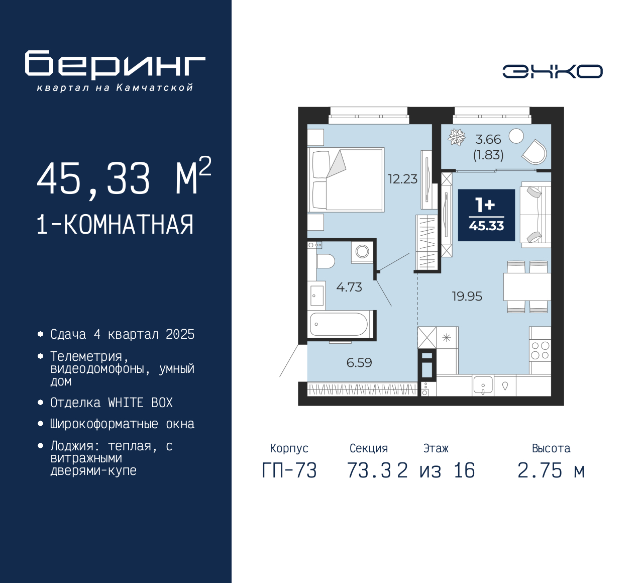 1-комн. квартира в ЖК "Беринг" на 2 этаже. Квартира без отделки, после оформления собственности можно делать ремонт. Общая площадь: 45.33 кв.м., жилая: 12.23 кв.м., площадь просторной кухни-столовой: 19.95 кв.м. Все окна выходят на одну сторону. В квартире одна лоджия, один совмещенный санузел. Высота потолков 2.75 м. Дом монолитный, многоподъездный, переменной этажности, от 9 до 22 этажей. Квартира находится в 73.3-й секции высотой 16 этажей в корпусе ГП-73. На этаже 8 квартир. В подъезде 1 пассажирский и 1 грузовой лифт. Окончание строительства - 4 квартал 2025 года. Оформление сделки по договору долевого участия. Подобно знаменитому исследователю, мы чувствуем себя первооткрывателями этой локации. Хотим показать новую суть места, сформировать для вас жизненный опыт, которого ещё не было. Беринг — район зелёного цвета. Беринг — район, который откроется вам с другой стороны. Впечатлит новым уровнем комфорта и качеством жизни. Беринг — открытие на карте города. Первый квартал расположен в районе Тура, в границах улиц: Камчатская – Западносибирская – Энтузиастов. Вокруг уже есть всё для того, чтобы ежедневная рутина была лишь частью жизни и не доставляла дискомфорта. Школы и детские сады, магазины и аптеки, поликлиника, места для семейного отдыха, пеших и велопрогулок, и даже рыбалки. Масштабное озеленение дворов — визитная карточка ЭНКО и ваш оазис спокойствия, чтобы отвлечься от повседневности. Раскидистые деревья, кустарники, травы и цветы — осталось остановиться, вдохнуть и расслабиться, глядя на эту природную красоту. Стилистика подъездов продолжает концепцию Беринга, вдохновлённого Камчаткой: сдержанный, но при этом впечатляющий дизайн соседствует с удобством и функциональностью. (AQID02315839)
