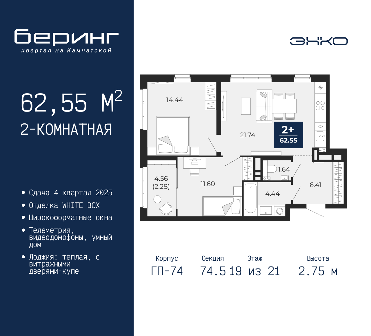 Продается 2-комн. квартира в ЖК "Беринг" на 19 этаже. Квартира без отделки, после выдачи ключей можно делать ремонт. Общая площадь: 62.55 кв.м., жилая: 26.04 кв.м., площадь просторной кухни-столовой: 21.74 кв.м. Угловая квартира, окна oбecпeчивaют paвнoмepнoe ocвeщeниe в тeчeниe дня. В квартире одна лоджия, один раздельный санузел. Высота потолков 2.75 м. Дом монолитный, многоподъездный, переменной этажности, от 9 до 21 этажей. Квартира находится в 74.5-й секции высотой 21 этаж в корпусе ГП-74. На этаже 7 квартир. В подъезде 1 пассажирский и 1 грузовой лифт. Окончание строительства - 4 квартал 2025 года. Оформление сделки по договору долевого участия. Подобно знаменитому исследователю, мы чувствуем себя первооткрывателями этой локации. Хотим показать новую суть места, сформировать для вас жизненный опыт, которого ещё не было. Беринг — район зелёного цвета. Беринг — район, который откроется вам с другой стороны. Впечатлит новым уровнем комфорта и качеством жизни. Беринг — открытие на карте города. Первый квартал расположен в районе Тура, в границах улиц: Камчатская – Западносибирская – Энтузиастов. Вокруг уже есть всё для того, чтобы ежедневная рутина была лишь частью жизни и не доставляла дискомфорта. Школы и детские сады, магазины и аптеки, поликлиника, места для семейного отдыха, пеших и велопрогулок, и даже рыбалки. Масштабное озеленение дворов — визитная карточка ЭНКО и ваш оазис спокойствия, чтобы отвлечься от повседневности. Раскидистые деревья, кустарники, травы и цветы — осталось остановиться, вдохнуть и расслабиться, глядя на эту природную красоту. Стилистика подъездов продолжает концепцию Беринга, вдохновлённого Камчаткой: сдержанный, но при этом впечатляющий дизайн соседствует с удобством и функциональностью. (AQID02316049)