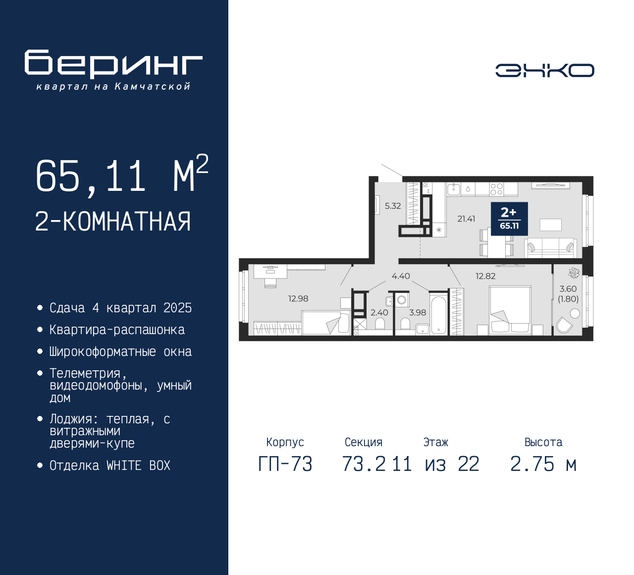 2-комн. квартира от застройщика в ЖК "Беринг" на 11 этаже. Квартира без отделки, новый владелец может сделать ремонт по индивидуальному проекту. Общая площадь: 65.11 кв.м., жилая: 25.8 кв.м., площадь просторной кухни-столовой: 21.41 кв.м. Квартира - распашонка, без проходных комнат, окна выходят на paзные стороны дома. В квартире одна лоджия, один совмещенный и один раздельный санузел. Высота потолков 2.75 м. Дом монолитный, многоподъездный, переменной этажности, от 9 до 22 этажей. Квартира находится в 73.2-й секции высотой 22 этажа в корпусе ГП-73. На этаже 7 квартир. В подъезде 1 пассажирский и 1 грузовой лифт. Окончание строительства - 4 квартал 2025 года. Оформление сделки по договору долевого участия. Подобно знаменитому исследователю, мы чувствуем себя первооткрывателями этой локации. Хотим показать новую суть места, сформировать для вас жизненный опыт, которого ещё не было. Беринг — район зелёного цвета. Беринг — район, который откроется вам с другой стороны. Впечатлит новым уровнем комфорта и качеством жизни. Беринг — открытие на карте города. Первый квартал расположен в районе Тура, в границах улиц: Камчатская – Западносибирская – Энтузиастов. Вокруг уже есть всё для того, чтобы ежедневная рутина была лишь частью жизни и не доставляла дискомфорта. Школы и детские сады, магазины и аптеки, поликлиника, места для семейного отдыха, пеших и велопрогулок, и даже рыбалки. Масштабное озеленение дворов — визитная карточка ЭНКО и ваш оазис спокойствия, чтобы отвлечься от повседневности. Раскидистые деревья, кустарники, травы и цветы — осталось остановиться, вдохнуть и расслабиться, глядя на эту природную красоту. Стилистика подъездов продолжает концепцию Беринга, вдохновлённого Камчаткой: сдержанный, но при этом впечатляющий дизайн соседствует с удобством и функциональностью. (AQID02316148)