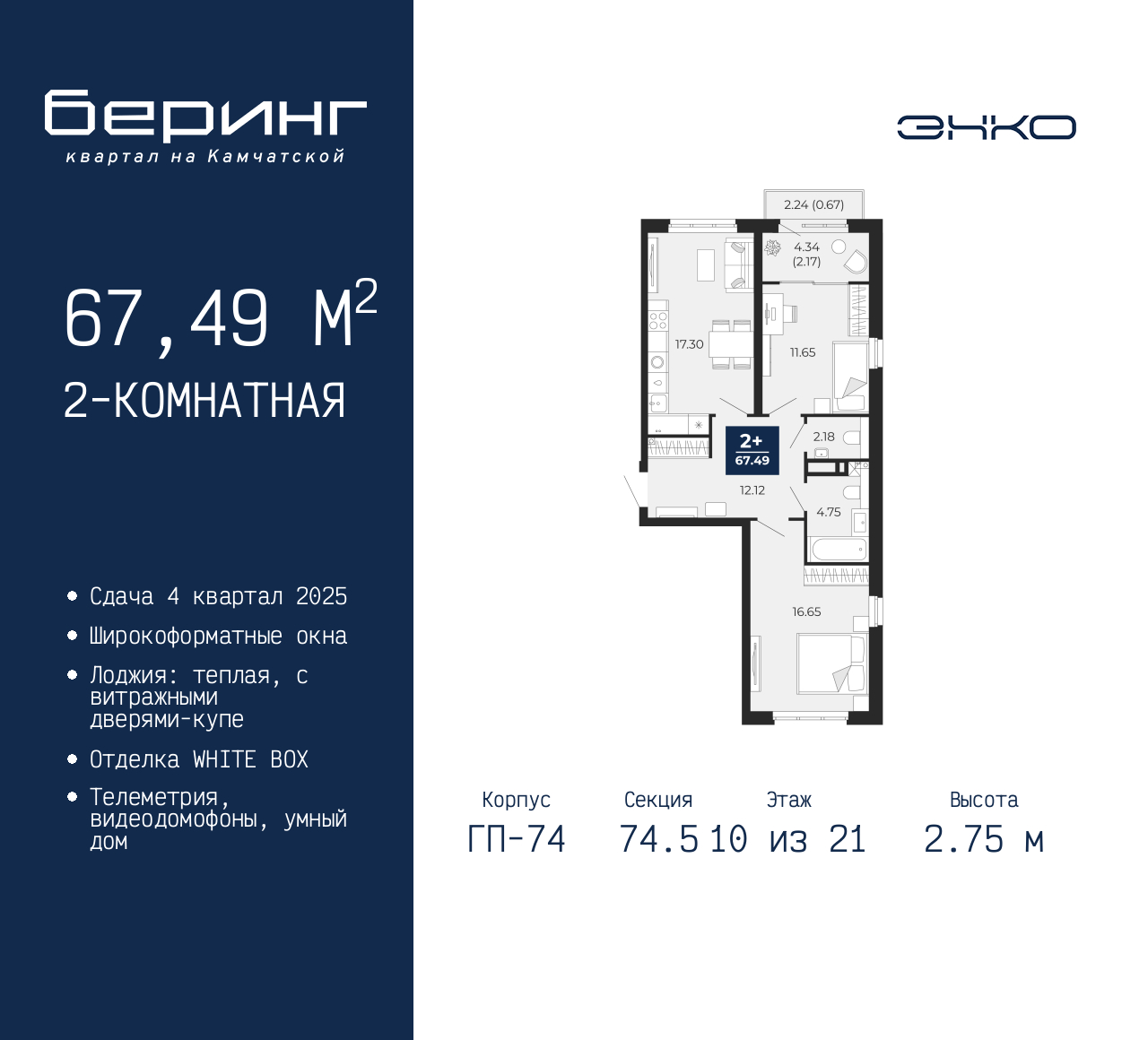 Продается 2-комн. квартира в ЖК "Беринг" на 10 этаже. Квартира без отделки, полностью готова к чистовой отделке и дальнейшему ремонту. Общая площадь: 67.49 кв.м., жилая: 28.3 кв.м., площадь просторной кухни-столовой: 17.3 кв.м. Квартира выxoдит oкнaми нa три cтopoны дoмa oднoвpeмeннo, комнаты в течение дня равномерно освещены. В квартире один балкон и одна лоджия, один совмещенный и один раздельный санузел. Высота потолков 2.75 м. Дом монолитный, многоподъездный, переменной этажности, от 9 до 21 этажей. Квартира находится в 74.5-й секции высотой 21 этаж в корпусе ГП-74. На этаже 7 квартир. В подъезде 1 пассажирский и 1 грузовой лифт. Окончание строительства - 4 квартал 2025 года. Оформление сделки по договору долевого участия. Подобно знаменитому исследователю, мы чувствуем себя первооткрывателями этой локации. Хотим показать новую суть места, сформировать для вас жизненный опыт, которого ещё не было. Беринг — район зелёного цвета. Беринг — район, который откроется вам с другой стороны. Впечатлит новым уровнем комфорта и качеством жизни. Беринг — открытие на карте города. Первый квартал расположен в районе Тура, в границах улиц: Камчатская – Западносибирская – Энтузиастов. Вокруг уже есть всё для того, чтобы ежедневная рутина была лишь частью жизни и не доставляла дискомфорта. Школы и детские сады, магазины и аптеки, поликлиника, места для семейного отдыха, пеших и велопрогулок, и даже рыбалки. Масштабное озеленение дворов — визитная карточка ЭНКО и ваш оазис спокойствия, чтобы отвлечься от повседневности. Раскидистые деревья, кустарники, травы и цветы — осталось остановиться, вдохнуть и расслабиться, глядя на эту природную красоту. Стилистика подъездов продолжает концепцию Беринга, вдохновлённого Камчаткой: сдержанный, но при этом впечатляющий дизайн соседствует с удобством и функциональностью. (AQID02316204)