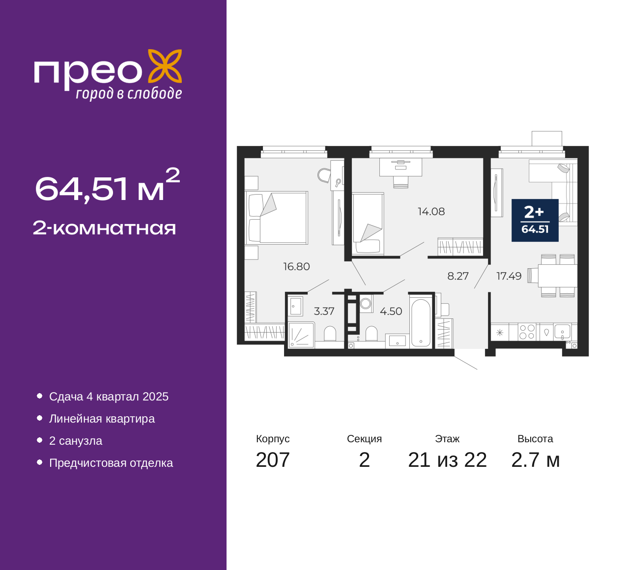 Продается 2-комн. квартира от застройщика с предчистовой отделкой в ЖК "Прео" на 21 этаже. Общая площадь: 64.51 кв.м., жилая: 30.88 кв.м., площадь просторной кухни-столовой: 17.49 кв.м. Комнаты изолированные, все окна выходят на одну сторону. В квартире два совмещенных санузла. Высота потолков 2.7 м. Дом монолитный, двухподъездный, высотой 22 этажа. Квартира находится во 2-й секции в корпусе 207. На этаже 8 квартир. В подъезде 1 пассажирский и 1 грузовой лифт. Окончание строительства - 4 квартал 2025 года. Оформление сделки по договору долевого участия. Преображенский — один из самых привлекательных районов для жизни! Это полностью самостоятельный жилой район с точки зрения инфраструктуры. Преображенский находится между Московским и Червишевским трактами в квартале улиц Закалужская — Вьюжная — Александра Протозанова. Не нужно ждать, когда появится инфраструктура — переезжайте на всё готовое. Вблизи расположены действующие школа и детский сад. В этом году откроется еще один сад, а в следующем году — школа. По соседству с Преображенским запланировано строительство городского парка «Комарово» площадью 38 гектар. За 10 минут можно доехать на автомобиле до крупных ТРЦ: «Лента», «Кристалл», «Леруа Мерлен», «Метро» и «Ашан». С 2018 года в районе открыт Соседский центр — пространство, созданное для формирования добрососедской среды, совместного досуга, общения и реализации соседских инициатив. Здесь проходят встречи соседей, а также сами жители района организовывают мероприятия. Организатором такого события может стать любой желающий. В квартирах выполнена качественная предчистовая отделка. Гладкие стены с финишным выравниванием по маякам. Ровный потолок для установки натяжного потолка. Установлены пятикамерные окна с двойным стеклопакетом (3 стекла). Дизайнерские холлы с видеонаблюдением, безбарьерным и прозрачным входом – всегда светло и спокойно. На первом этаже есть просторные колясочные, где все жители могут оставлять свои коляски и велосипеды. В Преображенском есть всё, что нужно для активного отдыха и занятий спортом. Мы сделали большое футбольное поле с безопасным покрытием. Также установили хоккейный корт, который оборудован по всем необходимым стандартам. Во дворах можно делать упражнения на специальных площадках с турниками. Весь район мы обустроили велодорожками, которые связаны в единый маршрут. У нас есть сухие фонтаны, бьющие из земли, деревья, веревки, сетки, скалодром, газон, песок и резинка — осталось просто дать своему ребенку право на свободную игру. По-настоящему хорошие дворы — это те, которые дети предпочитают соцсетям и телевизору. Аккредитация в банках: «Сбербанк России», ПАО «Газпромбанк», ОАО «Альфа-Банк», ПАО «Банк Уралсиб», ПАО Банк «ВТБ» и других. (AQID02355942)