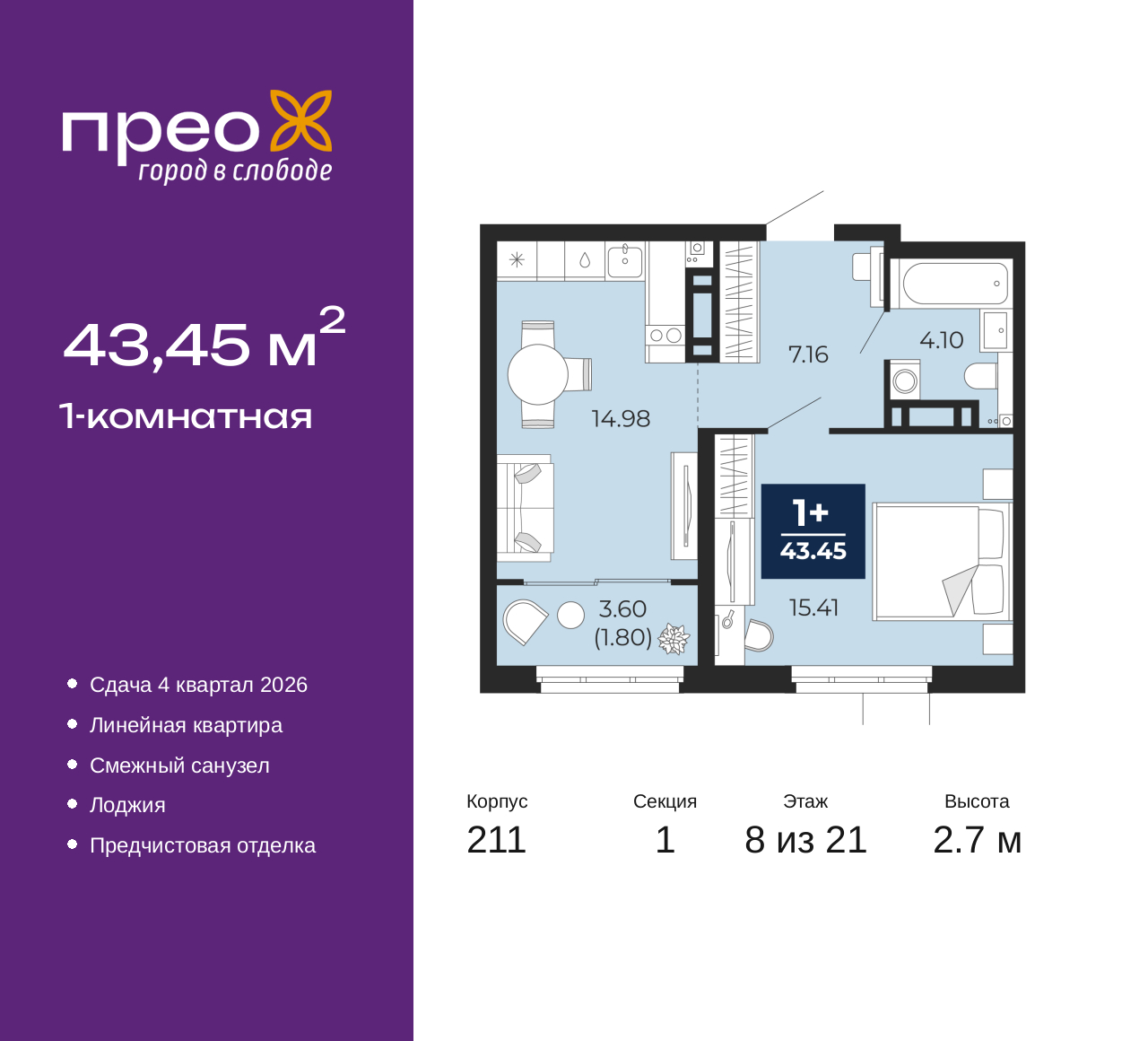 1-комн. квартира с предчистовой отделкой в ЖК "Прео" на 8 этаже. Общая площадь: 43.45 кв.м., жилая: 15.41 кв.м., площадь просторной кухни-столовой: 14.98 кв.м. Все окна выходят на одну сторону. В квартире одна лоджия, один совмещенный санузел. Высота потолков 2.7 м. Дом монолитный, черырехподъездный, переменной этажности, от 14 до 21 этажей. Квартира находится в 1-й секции высотой 21 этаж в корпусе 211. На этаже 8 квартир. В подъезде 1 пассажирский и 1 грузовой лифт. Окончание строительства - 4 квартал 2026 года. Оформление сделки по договору долевого участия. Преображенский — один из самых привлекательных районов для жизни! Это полностью самостоятельный жилой район с точки зрения инфраструктуры. Преображенский находится между Московским и Червишевским трактами в квартале улиц Закалужская — Вьюжная — Александра Протозанова. Не нужно ждать, когда появится инфраструктура — переезжайте на всё готовое. Вблизи расположены действующие школа и детский сад. В этом году откроется еще один сад, а в следующем году — школа. По соседству с Преображенским запланировано строительство городского парка «Комарово» площадью 38 гектар. За 10 минут можно доехать на автомобиле до крупных ТРЦ: «Лента», «Кристалл», «Леруа Мерлен», «Метро» и «Ашан». С 2018 года в районе открыт Соседский центр — пространство, созданное для формирования добрососедской среды, совместного досуга, общения и реализации соседских инициатив. Здесь проходят встречи соседей, а также сами жители района организовывают мероприятия. Организатором такого события может стать любой желающий. В квартирах выполнена качественная предчистовая отделка. Гладкие стены с финишным выравниванием по маякам. Ровный потолок для установки натяжного потолка. Установлены пятикамерные окна с двойным стеклопакетом (3 стекла). Дизайнерские холлы с видеонаблюдением, безбарьерным и прозрачным входом – всегда светло и спокойно. На первом этаже есть просторные колясочные, где все жители могут оставлять свои коляски и велосипеды. В Преображенском есть всё, что нужно для активного отдыха и занятий спортом. Мы сделали большое футбольное поле с безопасным покрытием. Также установили хоккейный корт, который оборудован по всем необходимым стандартам. Во дворах можно делать упражнения на специальных площадках с турниками. Весь район мы обустроили велодорожками, которые связаны в единый маршрут. У нас есть сухие фонтаны, бьющие из земли, деревья, веревки, сетки, скалодром, газон, песок и резинка — осталось просто дать своему ребенку право на свободную игру. По-настоящему хорошие дворы — это те, которые дети предпочитают соцсетям и телевизору. Аккредитация в банках: «Сбербанк России», ПАО «Банк Уралсиб», ПАО Банк «ВТБ», ОАО «Альфа-Банк», ПАО «Газпромбанк» и других. (AQID02427584)