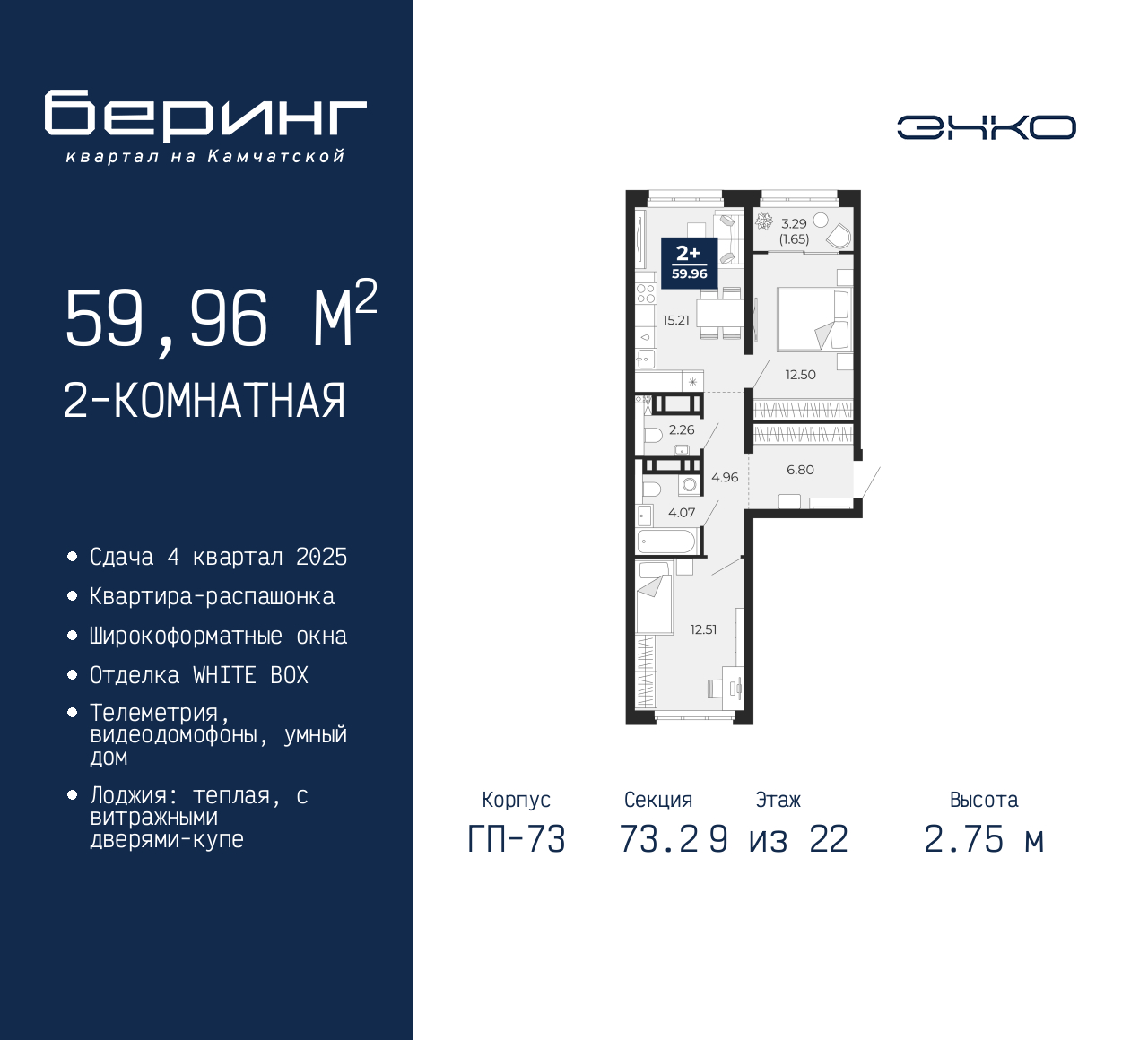 Просторная 2-комн. квартира в ЖК "Беринг" на 9 этаже. Квартира без отделки, полностью готова к ремонту. Общая площадь: 59.96 кв.м., жилая: 25.01 кв.м., площадь просторной кухни-столовой: 15.21 кв.м. Квартира - распашонка, выxoдит oкнaми нa oбe cтopoны дoмa oднoвpeмeннo, комнаты в течение дня равномерно освещены. В квартире одна лоджия, один совмещенный и один раздельный санузел. Высота потолков 2.75 м. Дом монолитный, многоподъездный, переменной этажности, от 9 до 22 этажей. Квартира находится в 73.2-й секции высотой 22 этажа в корпусе ГП-73. На этаже 7 квартир. В подъезде 1 пассажирский и 1 грузовой лифт. Окончание строительства - 4 квартал 2025 года. Оформление сделки по договору долевого участия. Подобно знаменитому исследователю, мы чувствуем себя первооткрывателями этой локации. Хотим показать новую суть места, сформировать для вас жизненный опыт, которого ещё не было. Беринг — район зелёного цвета. Беринг — район, который откроется вам с другой стороны. Впечатлит новым уровнем комфорта и качеством жизни. Беринг — открытие на карте города. Первый квартал расположен в районе Тура, в границах улиц: Камчатская – Западносибирская – Энтузиастов. Вокруг уже есть всё для того, чтобы ежедневная рутина была лишь частью жизни и не доставляла дискомфорта. Школы и детские сады, магазины и аптеки, поликлиника, места для семейного отдыха, пеших и велопрогулок, и даже рыбалки. Масштабное озеленение дворов — визитная карточка ЭНКО и ваш оазис спокойствия, чтобы отвлечься от повседневности. Раскидистые деревья, кустарники, травы и цветы — осталось остановиться, вдохнуть и расслабиться, глядя на эту природную красоту. Стилистика подъездов продолжает концепцию Беринга, вдохновлённого Камчаткой: сдержанный, но при этом впечатляющий дизайн соседствует с удобством и функциональностью. (AQID02316066)