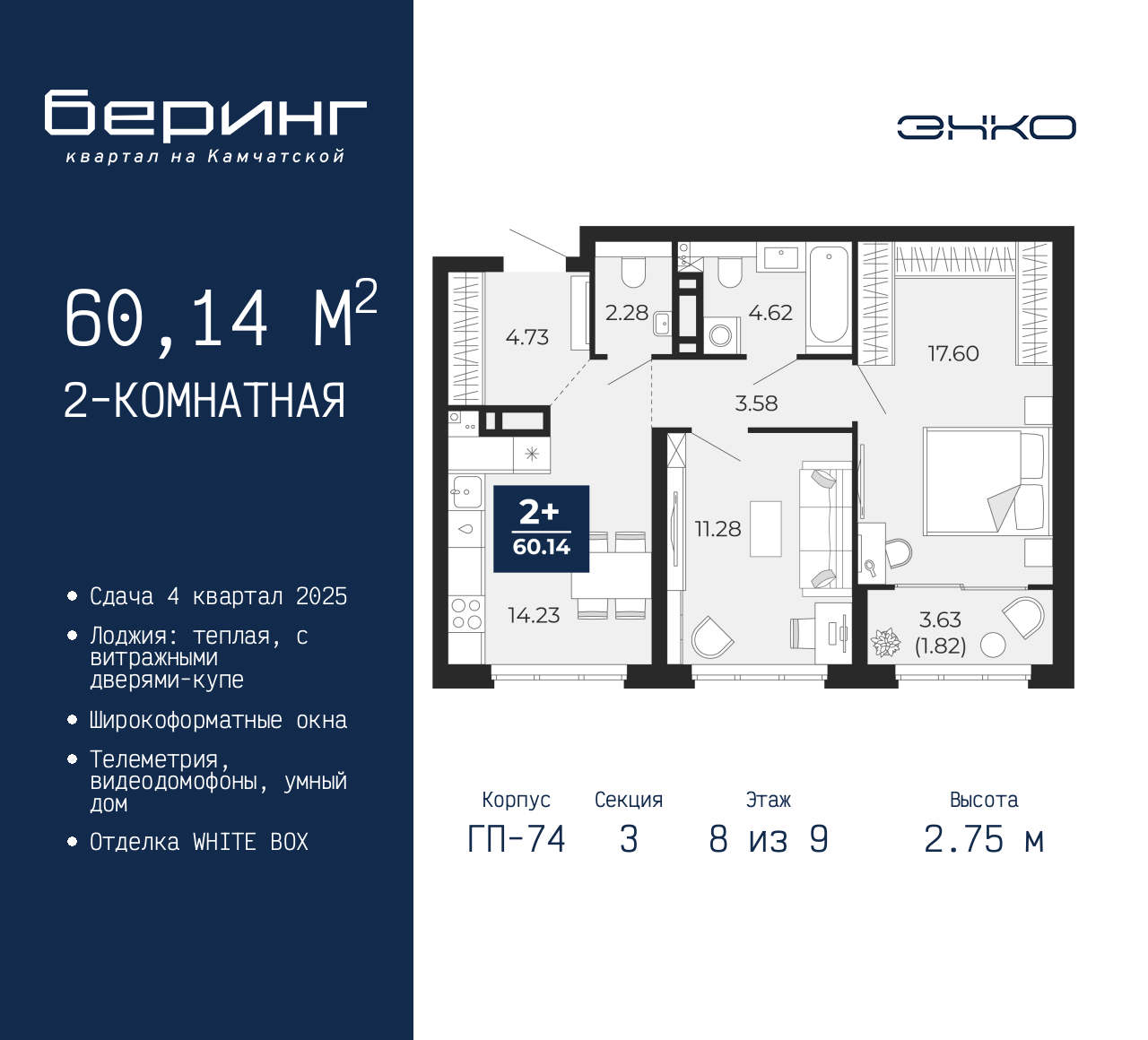 Просторная 2-комн. квартира в ЖК "Беринг" на 8 этаже. Квартира без отделки, после оформления собственности можно делать ремонт. Общая площадь: 60.14 кв.м., жилая: 28.88 кв.м., площадь просторной кухни-столовой: 14.23 кв.м. Комнаты изолированные, все окна выходят на одну сторону. В квартире одна лоджия, один совмещенный и один раздельный санузел. Высота потолков 2.75 м. Дом монолитный, многоподъездный, переменной этажности, от 9 до 21 этажей. Квартира находится в 3-й секции высотой 9 этажей в корпусе ГП-74. На этаже 7 квартир. В подъезде 1 грузовой лифт. Окончание строительства - 4 квартал 2025 года. Оформление сделки по договору долевого участия. Подобно знаменитому исследователю, мы чувствуем себя первооткрывателями этой локации. Хотим показать новую суть места, сформировать для вас жизненный опыт, которого ещё не было. Беринг — район зелёного цвета. Беринг — район, который откроется вам с другой стороны. Впечатлит новым уровнем комфорта и качеством жизни. Беринг — открытие на карте города. Первый квартал расположен в районе Тура, в границах улиц: Камчатская – Западносибирская – Энтузиастов. Вокруг уже есть всё для того, чтобы ежедневная рутина была лишь частью жизни и не доставляла дискомфорта. Школы и детские сады, магазины и аптеки, поликлиника, места для семейного отдыха, пеших и велопрогулок, и даже рыбалки. Масштабное озеленение дворов — визитная карточка ЭНКО и ваш оазис спокойствия, чтобы отвлечься от повседневности. Раскидистые деревья, кустарники, травы и цветы — осталось остановиться, вдохнуть и расслабиться, глядя на эту природную красоту. Стилистика подъездов продолжает концепцию Беринга, вдохновлённого Камчаткой: сдержанный, но при этом впечатляющий дизайн соседствует с удобством и функциональностью. (AQID02316044)
