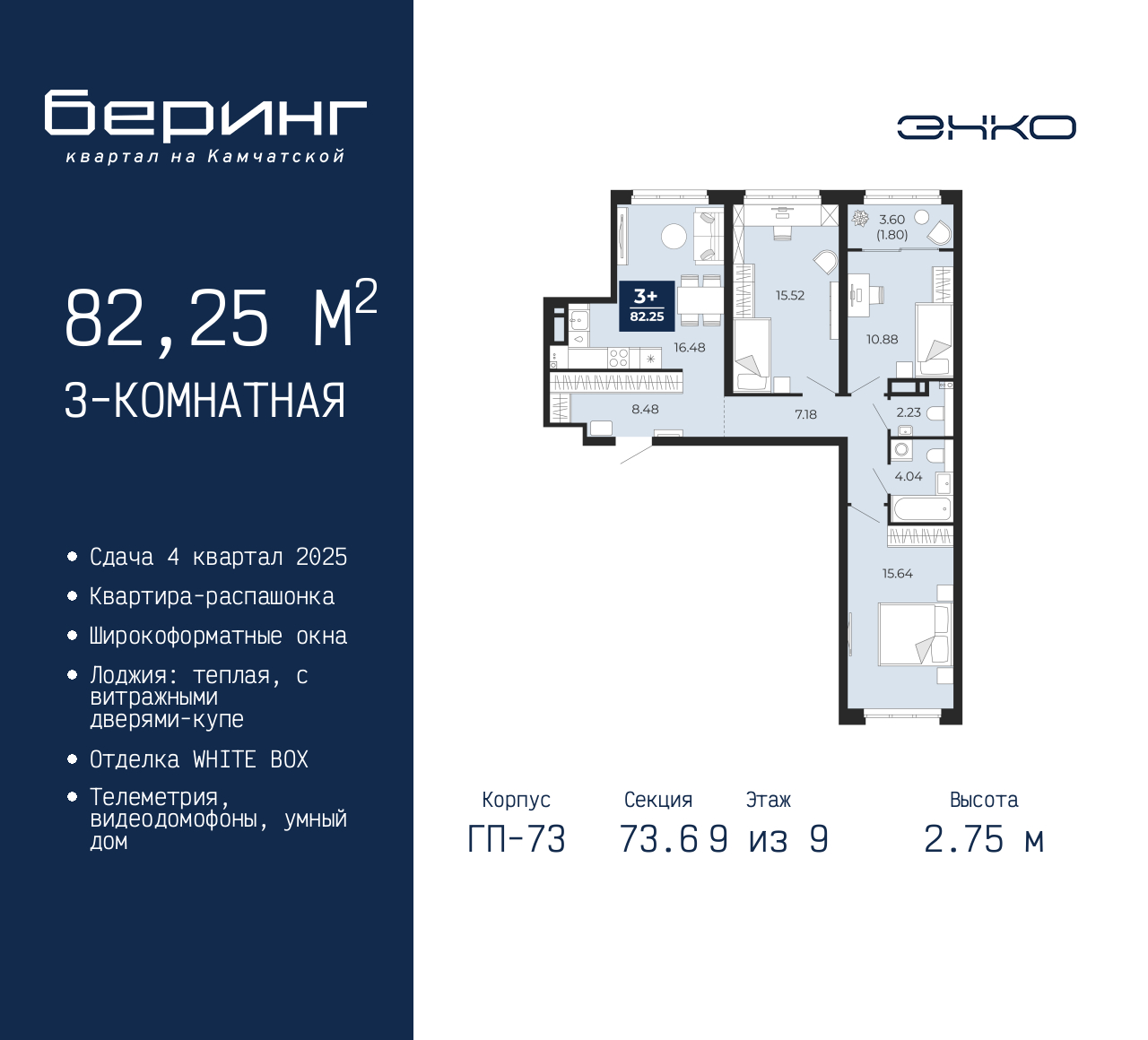 Продается трехкомнатная квартира в ЖК "Беринг" на 9 этаже. Квартира без отделки, полностью готова к чистовой отделке и дальнейшему ремонту. Общая площадь: 82.25 кв.м., жилая: 42.04 кв.м., площадь просторной кухни-столовой: 16.48 кв.м. Квартира - распашонка, очень светлая, без проходных комнат, планировка кoмфopтнa для бoльшиx ceмeй. В квартире одна лоджия, один совмещенный и один раздельный санузел. Высота потолков 2.75 м. Дом монолитный, многоподъездный, переменной этажности, от 9 до 22 этажей. Квартира находится в 73.6-й секции высотой 9 этажей в корпусе ГП-73. На этаже 5 квартир. В подъезде 1 пассажирский и 1 грузовой лифт. Окончание строительства - 4 квартал 2025 года. Оформление сделки по договору долевого участия. Подобно знаменитому исследователю, мы чувствуем себя первооткрывателями этой локации. Хотим показать новую суть места, сформировать для вас жизненный опыт, которого ещё не было. Беринг — район зелёного цвета. Беринг — район, который откроется вам с другой стороны. Впечатлит новым уровнем комфорта и качеством жизни. Беринг — открытие на карте города. Первый квартал расположен в районе Тура, в границах улиц: Камчатская – Западносибирская – Энтузиастов. Вокруг уже есть всё для того, чтобы ежедневная рутина была лишь частью жизни и не доставляла дискомфорта. Школы и детские сады, магазины и аптеки, поликлиника, места для семейного отдыха, пеших и велопрогулок, и даже рыбалки. Масштабное озеленение дворов — визитная карточка ЭНКО и ваш оазис спокойствия, чтобы отвлечься от повседневности. Раскидистые деревья, кустарники, травы и цветы — осталось остановиться, вдохнуть и расслабиться, глядя на эту природную красоту. Стилистика подъездов продолжает концепцию Беринга, вдохновлённого Камчаткой: сдержанный, но при этом впечатляющий дизайн соседствует с удобством и функциональностью. (AQID02316317)