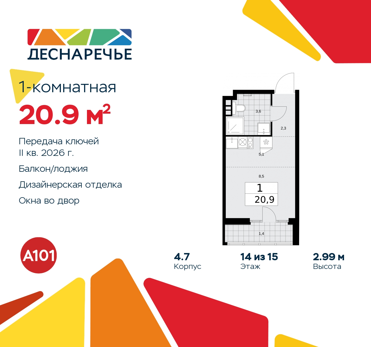 Продается 1-комн. квартира-студия от застройщика с отделкой в ЖК "Деснаречье" на 14 этаже. Общая площадь: 20.9 кв.м., площадь гостиной 13.6 кв.м., из которых 5.1 кв.м. выделено под кухонную зону. Все окна выходят на одну сторону. В квартире один балкон, один совмещенный санузел. Высота потолков 2.99 м. Эта квартира будет сдана с дизайнеркой отделкой "под ключ". Специально для вас мы разработали несколько решений дизайнерской отделки. В отделке используются только современный высококлассные материалы, на все работы предоставляется гарантия. В таком случае вы оплачиваете отделку в сегодняшних ценах, а эту стоимость вы можете разнести в ипотечных платежах. Дом монолитный, трехподъездный, высотой 15 этажей. Квартира находится в 1-й секции в корпусе 4.7. На этаже 6 квартир. В подъезде 1 пассажирский и 1 грузовой лифт. Начало строительства - 3 квартал 2023 года. Окончание строительства - 2 квартал 2026 года. Оформление сделки по договору долевого участия. Артикул квартиры по базе застройщика 88К-4.7-1518. ПРЕДЛОЖЕНИЯ ОТ ЗАСТРОЙЩИКА В ОКТЯБРЕ 2025: Ипотека от 13,9 % для всех! На весь срок. "Семейная ипотека" вернулась. Ставка от 3,5 % на весь срок! Без удорожания! Выгодное ипотечное комбо: Ипотека от 2200 р./мес. и от 6 % после рождения ребёнка! Ипотека для всех "Держи пять!" - ставка 5 % на 2 года! *более подробную информацию по скидкам и акциям уточняйте в отделе продаж Масштабный проект "Деснаречье" на юго-западе Москвы, который включает три новых района («квартала»), объединённые общей идеей – воплотить в реальность мечты современных жителей столицы об интересном, комфортном и разноплановом городском пространстве в окружении рек и лесов, словно сошедших с полотен русских живописцев: - «Берег» оценят все, кому близка водная стихия: плеск волн, солнечные блики и прогулки вдоль тихого течения речи. - «Лес» утопает в зелени парков и лесов. Здесь соблюдён идеальный баланс загородного спокойствия и столичного комфорта. - «Парк», самый энергичный и яркий, отличается высокой концентрацией пространств для спорта и творчества. Жилой комплекс "Деснаречье" расположится в 12 км от МКАД по современному Калужскому шоссе. Внешний облик зданий соответствует современному стилю и стандартам, характерным и для других популярных проектов ГК «А101»: сочетание контрастных тонов, большое количество остекления, в котором отражается небо, гармония с природным окружением. Весь город - в вашем районе. Находиться на территории «15-минутного города» значит иметь всё необходимое для полноценной жизни в шаговой доступности. Маршруты в районе «Деснаречье» выстроены так, чтобы добраться до магазинов, парков, школ, салонов услуг и других объектов можно было всего за несколько минут пешком или на велосипеде. Двор закрытый от машин – это тишина, комфорт и безопасность, поэтому все машино-места (включая «семейные» и увеличенные, с возможностью установки роллетных шкафов) находятся в подземном паркинге. В паркинги можно спуститься на лифте из любого подъезда или по лестнице. Рядом с «Деснаречьем» в 2027 году планируется открытие станции метро «Десна», до которой будет удобно добраться пешком или на велосипеде. Дорога на автомобиле до перехватывающих парковок станций «Ольховая» и «Прокшино» займёт около 10 минут. В процессе реализации проекта будут появляться новые маршруты общественного транспорта по районам. Уже с