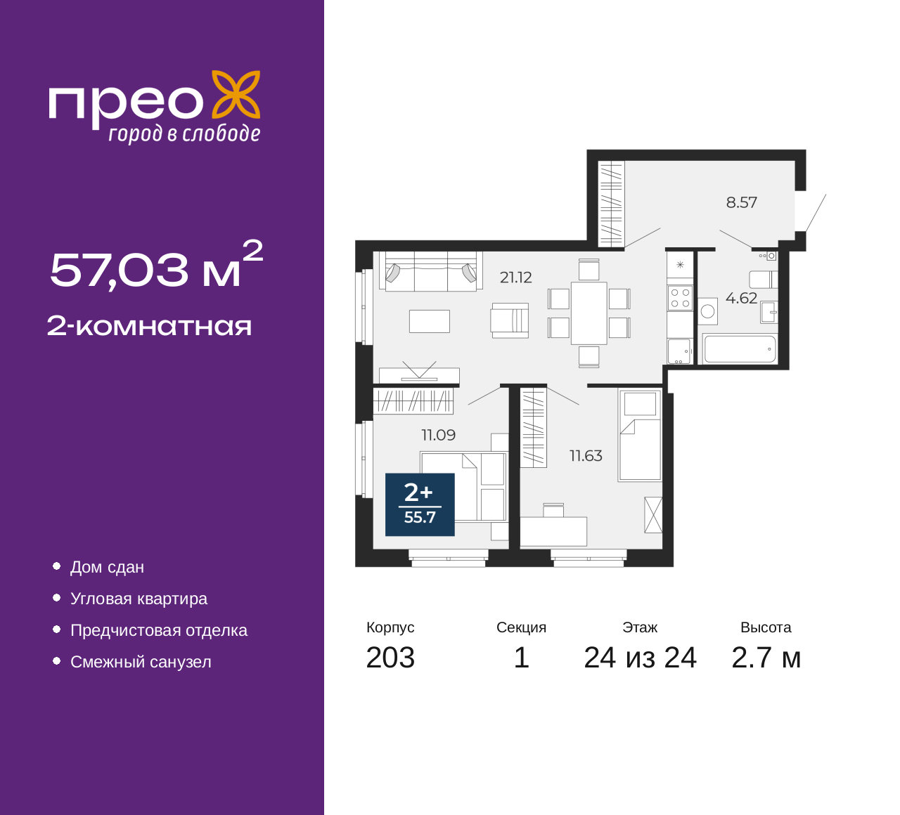 2-комн. квартира с предчистовой отделкой в ЖК "Прео" на 24 этаже. Общая площадь: 57.03 кв.м., жилая: 22.72 кв.м., площадь просторной кухни-столовой: 21.12 кв.м. Квартира угловая, очень светлая, естественная вентиляция при открытии окон. В квартире один совмещенный санузел. Высота потолков 2.7 м. Квартира находится в корпусе 203. Дом монолитный, одноподъездный, высотой 24 этажа. На этаже 14 квартир. В подъезде 2 грузовых лифта. Строительство завершено, дом сдан в 4 квартале 2024 года. Оформление сделки по договору купли-продажи. Преображенский — один из самых привлекательных районов для жизни! Это полностью самостоятельный жилой район с точки зрения инфраструктуры. Преображенский находится между Московским и Червишевским трактами в квартале улиц Закалужская — Вьюжная — Александра Протозанова. Не нужно ждать, когда появится инфраструктура — переезжайте на всё готовое. Вблизи расположены действующие школа и детский сад. В этом году откроется еще один сад, а в следующем году — школа. По соседству с Преображенским запланировано строительство городского парка «Комарово» площадью 38 гектар. За 10 минут можно доехать на автомобиле до крупных ТРЦ: «Лента», «Кристалл», «Леруа Мерлен», «Метро» и «Ашан». С 2018 года в районе открыт Соседский центр — пространство, созданное для формирования добрососедской среды, совместного досуга, общения и реализации соседских инициатив. Здесь проходят встречи соседей, а также сами жители района организовывают мероприятия. Организатором такого события может стать любой желающий. В квартирах выполнена качественная предчистовая отделка. Гладкие стены с финишным выравниванием по маякам. Ровный потолок для установки натяжного потолка. Установлены пятикамерные окна с двойным стеклопакетом (3 стекла). Дизайнерские холлы с видеонаблюдением, безбарьерным и прозрачным входом – всегда светло и спокойно. На первом этаже есть просторные колясочные, где все жители могут оставлять свои коляски и велосипеды. В Преображенском есть всё, что нужно для активного отдыха и занятий спортом. Мы сделали большое футбольное поле с безопасным покрытием. Также установили хоккейный корт, который оборудован по всем необходимым стандартам. Во дворах можно делать упражнения на специальных площадках с турниками. Весь район мы обустроили велодорожками, которые связаны в единый маршрут. У нас есть сухие фонтаны, бьющие из земли, деревья, веревки, сетки, скалодром, газон, песок и резинка — осталось просто дать своему ребенку право на свободную игру. По-настоящему хорошие дворы — это те, которые дети предпочитают соцсетям и телевизору. Аккредитация в банках: ПАО «Банк Уралсиб», ПАО «Газпромбанк», ПАО Банк «ВТБ», ОАО «Альфа-Банк», «Сбербанк России» и других. (AQID02278568)