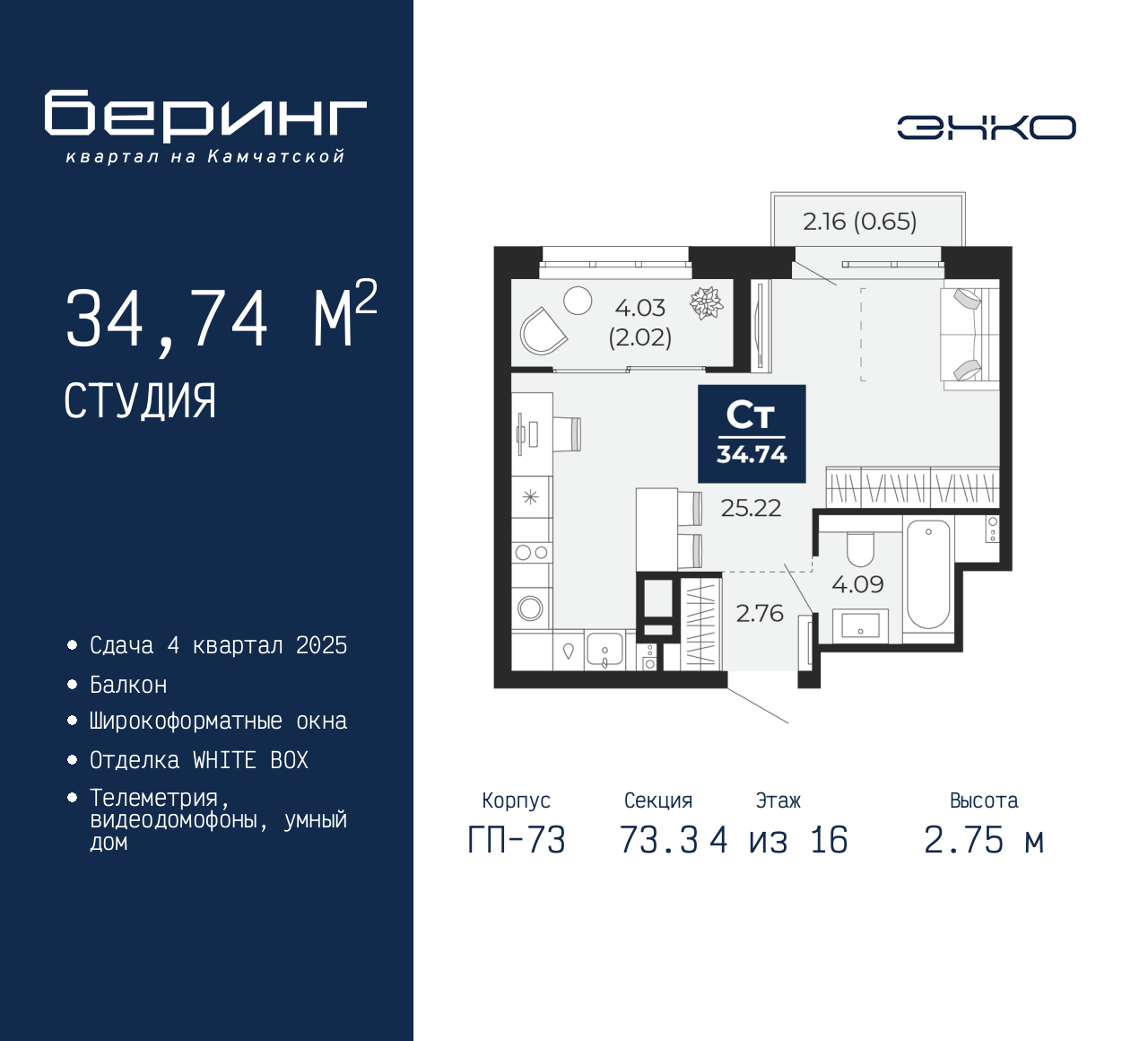 Просторная 1-комн. квартира-студия в ЖК "Беринг" на 4 этаже. Квартира без отделки, после выдачи ключей можно делать ремонт. Общая площадь: 34.74 кв.м., площадь гостиной 25.22 кв.м., из которых 5 кв.м. выделено под кухонную зону. Все окна выходят на одну сторону. В квартире один балкон, один совмещенный санузел. Высота потолков 2.75 м. Дом монолитный, многоподъездный, переменной этажности, от 9 до 22 этажей. Квартира находится в 73.3-й секции высотой 16 этажей в корпусе ГП-73. На этаже 8 квартир. В подъезде 1 пассажирский и 1 грузовой лифт. Окончание строительства - 4 квартал 2025 года. Оформление сделки по договору долевого участия. Подобно знаменитому исследователю, мы чувствуем себя первооткрывателями этой локации. Хотим показать новую суть места, сформировать для вас жизненный опыт, которого ещё не было. Беринг — район зелёного цвета. Беринг — район, который откроется вам с другой стороны. Впечатлит новым уровнем комфорта и качеством жизни. Беринг — открытие на карте города. Первый квартал расположен в районе Тура, в границах улиц: Камчатская – Западносибирская – Энтузиастов. Вокруг уже есть всё для того, чтобы ежедневная рутина была лишь частью жизни и не доставляла дискомфорта. Школы и детские сады, магазины и аптеки, поликлиника, места для семейного отдыха, пеших и велопрогулок, и даже рыбалки. Масштабное озеленение дворов — визитная карточка ЭНКО и ваш оазис спокойствия, чтобы отвлечься от повседневности. Раскидистые деревья, кустарники, травы и цветы — осталось остановиться, вдохнуть и расслабиться, глядя на эту природную красоту. Стилистика подъездов продолжает концепцию Беринга, вдохновлённого Камчаткой: сдержанный, но при этом впечатляющий дизайн соседствует с удобством и функциональностью. (AQID02315570)