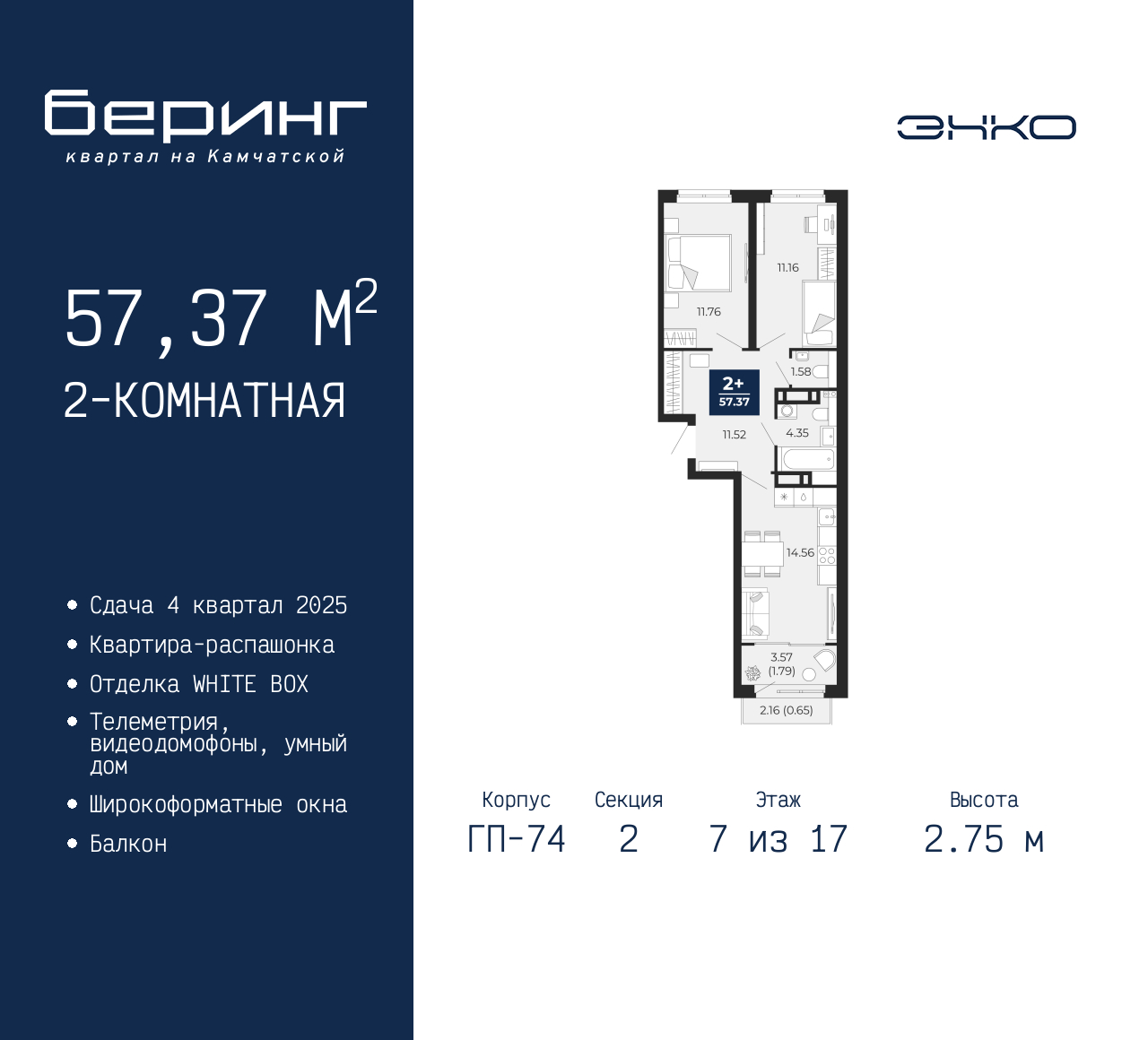 - Общая площадь 57.37 м²