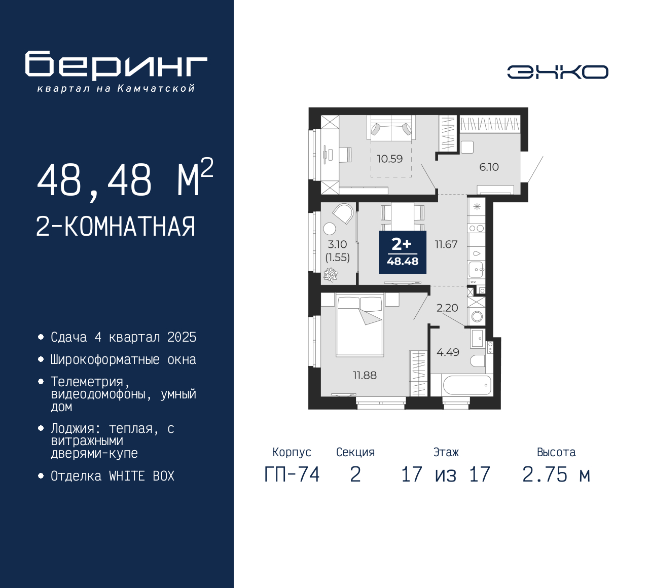 - Общая площадь 48.48 м²