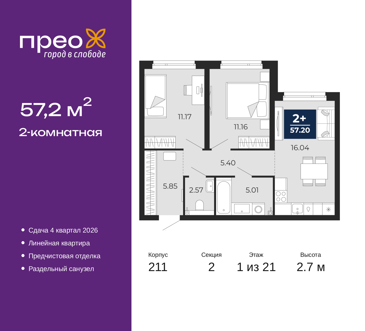 - Общая площадь 57.2 м²