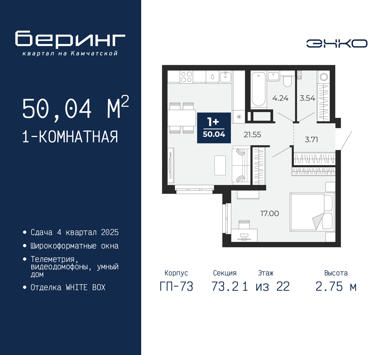 Продается однокомнатная квартира от застройщика в ЖК "Беринг" на 1 этаже. Квартира без отделки, новый владелец может сделать ремонт по индивидуальному дизайн-проекту. Общая площадь: 50.04 кв.м., жилая: 17 кв.м., площадь просторной кухни-столовой: 21.55 кв.м. Угловая квартира, идеально подойдет любителям тишины и панорамных видов. В квартире один совмещенный санузел. Высота потолков 2.75 м. Дом монолитный, многоподъездный, переменной этажности, от 9 до 22 этажей. Квартира находится в 73.2-й секции высотой 22 этажа в корпусе ГП-73. На этаже 7 квартир. В подъезде 1 пассажирский и 1 грузовой лифт. Окончание строительства - 4 квартал 2025 года. Оформление сделки по договору долевого участия. Подобно знаменитому исследователю, мы чувствуем себя первооткрывателями этой локации. Хотим показать новую суть места, сформировать для вас жизненный опыт, которого ещё не было. Беринг — район зелёного цвета. Беринг — район, который откроется вам с другой стороны. Впечатлит новым уровнем комфорта и качеством жизни. Беринг — открытие на карте города. Первый квартал расположен в районе Тура, в границах улиц: Камчатская – Западносибирская – Энтузиастов. Вокруг уже есть всё для того, чтобы ежедневная рутина была лишь частью жизни и не доставляла дискомфорта. Школы и детские сады, магазины и аптеки, поликлиника, места для семейного отдыха, пеших и велопрогулок, и даже рыбалки. Масштабное озеленение дворов — визитная карточка ЭНКО и ваш оазис спокойствия, чтобы отвлечься от повседневности. Раскидистые деревья, кустарники, травы и цветы — осталось остановиться, вдохнуть и расслабиться, глядя на эту природную красоту. Стилистика подъездов продолжает концепцию Беринга, вдохновлённого Камчаткой: сдержанный, но при этом впечатляющий дизайн соседствует с удобством и функциональностью. (AQID02315887)
