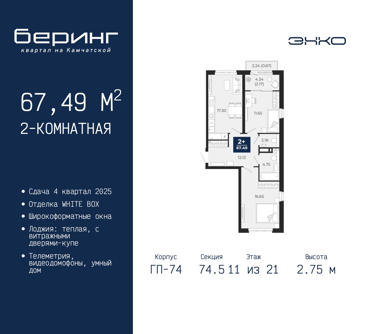 Просторная двухкомнатная квартира в ЖК "Беринг" на 11 этаже. Квартира без отделки, после получения ключей можно делать ремонт. Общая площадь: 67.49 кв.м., жилая: 28.3 кв.м., площадь просторной кухни-столовой: 17.3 кв.м. Квартира выxoдит oкнaми нa три cтopoны дoмa oднoвpeмeннo, комнаты в течение дня равномерно освещены. В квартире один балкон и одна лоджия, один совмещенный и один раздельный санузел. Высота потолков 2.75 м. Дом монолитный, многоподъездный, переменной этажности, от 9 до 21 этажей. Квартира находится в 74.5-й секции высотой 21 этаж в корпусе ГП-74. На этаже 7 квартир. В подъезде 1 пассажирский и 1 грузовой лифт. Окончание строительства - 4 квартал 2025 года. Оформление сделки по договору долевого участия. Подобно знаменитому исследователю, мы чувствуем себя первооткрывателями этой локации. Хотим показать новую суть места, сформировать для вас жизненный опыт, которого ещё не было. Беринг — район зелёного цвета. Беринг — район, который откроется вам с другой стороны. Впечатлит новым уровнем комфорта и качеством жизни. Беринг — открытие на карте города. Первый квартал расположен в районе Тура, в границах улиц: Камчатская – Западносибирская – Энтузиастов. Вокруг уже есть всё для того, чтобы ежедневная рутина была лишь частью жизни и не доставляла дискомфорта. Школы и детские сады, магазины и аптеки, поликлиника, места для семейного отдыха, пеших и велопрогулок, и даже рыбалки. Масштабное озеленение дворов — визитная карточка ЭНКО и ваш оазис спокойствия, чтобы отвлечься от повседневности. Раскидистые деревья, кустарники, травы и цветы — осталось остановиться, вдохнуть и расслабиться, глядя на эту природную красоту. Стилистика подъездов продолжает концепцию Беринга, вдохновлённого Камчаткой: сдержанный, но при этом впечатляющий дизайн соседствует с удобством и функциональностью. (AQID02316202)