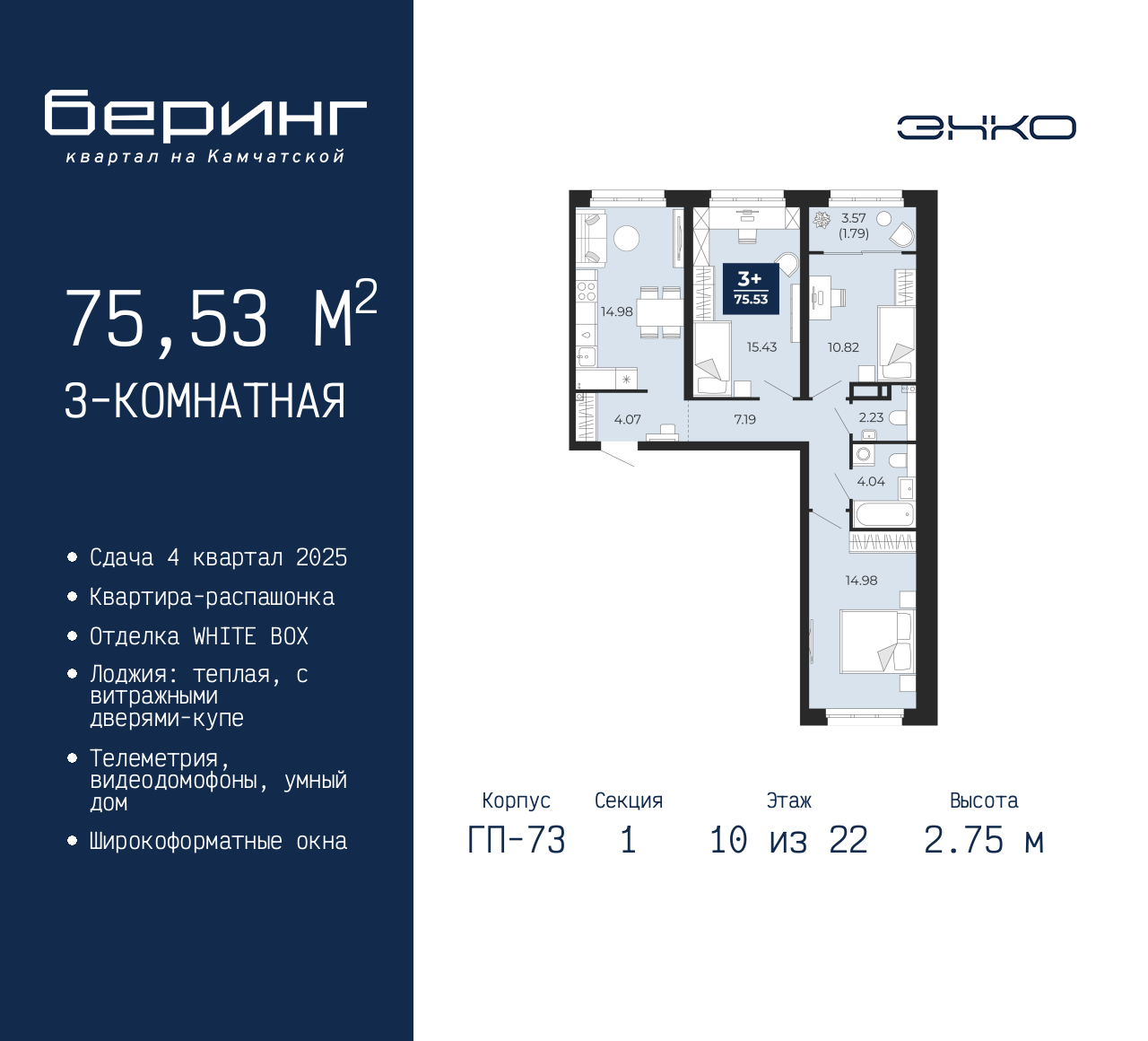- Общая площадь 75.53 м²