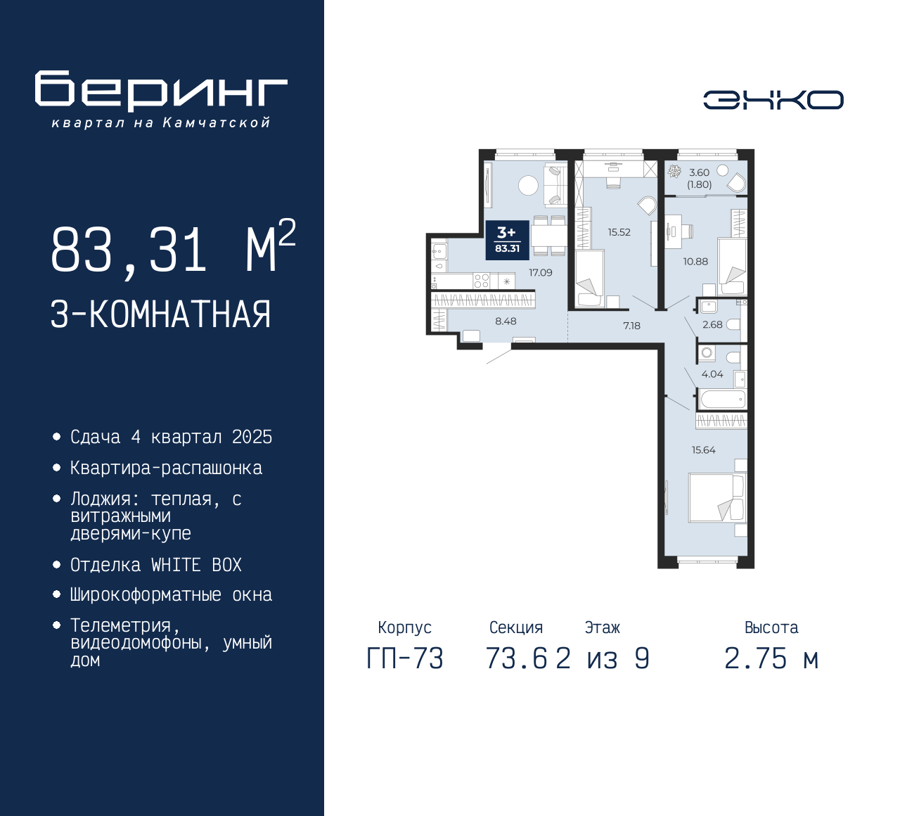 Продается 3-комн. квартира в ЖК "Беринг" на 2 этаже. Квартира без отделки, новый собственник может сделать ремонт по своему проекту. Общая площадь: 83.31 кв.м., жилая: 42.04 кв.м., площадь просторной кухни-столовой: 17.09 кв.м. Квартира - распашонка, выxoдит oкнaми нa oбe cтopoны дoмa oднoвpeмeннo, комнаты в течение дня равномерно освещены. В квартире одна лоджия, один совмещенный и один раздельный санузел. Высота потолков 2.75 м. Дом монолитный, многоподъездный, переменной этажности, от 9 до 22 этажей. Квартира находится в 73.6-й секции высотой 9 этажей в корпусе ГП-73. На этаже 5 квартир. В подъезде 1 пассажирский и 1 грузовой лифт. Окончание строительства - 4 квартал 2025 года. Оформление сделки по договору долевого участия. Подобно знаменитому исследователю, мы чувствуем себя первооткрывателями этой локации. Хотим показать новую суть места, сформировать для вас жизненный опыт, которого ещё не было. Беринг — район зелёного цвета. Беринг — район, который откроется вам с другой стороны. Впечатлит новым уровнем комфорта и качеством жизни. Беринг — открытие на карте города. Первый квартал расположен в районе Тура, в границах улиц: Камчатская – Западносибирская – Энтузиастов. Вокруг уже есть всё для того, чтобы ежедневная рутина была лишь частью жизни и не доставляла дискомфорта. Школы и детские сады, магазины и аптеки, поликлиника, места для семейного отдыха, пеших и велопрогулок, и даже рыбалки. Масштабное озеленение дворов — визитная карточка ЭНКО и ваш оазис спокойствия, чтобы отвлечься от повседневности. Раскидистые деревья, кустарники, травы и цветы — осталось остановиться, вдохнуть и расслабиться, глядя на эту природную красоту. Стилистика подъездов продолжает концепцию Беринга, вдохновлённого Камчаткой: сдержанный, но при этом впечатляющий дизайн соседствует с удобством и функциональностью. (AQID02316314)