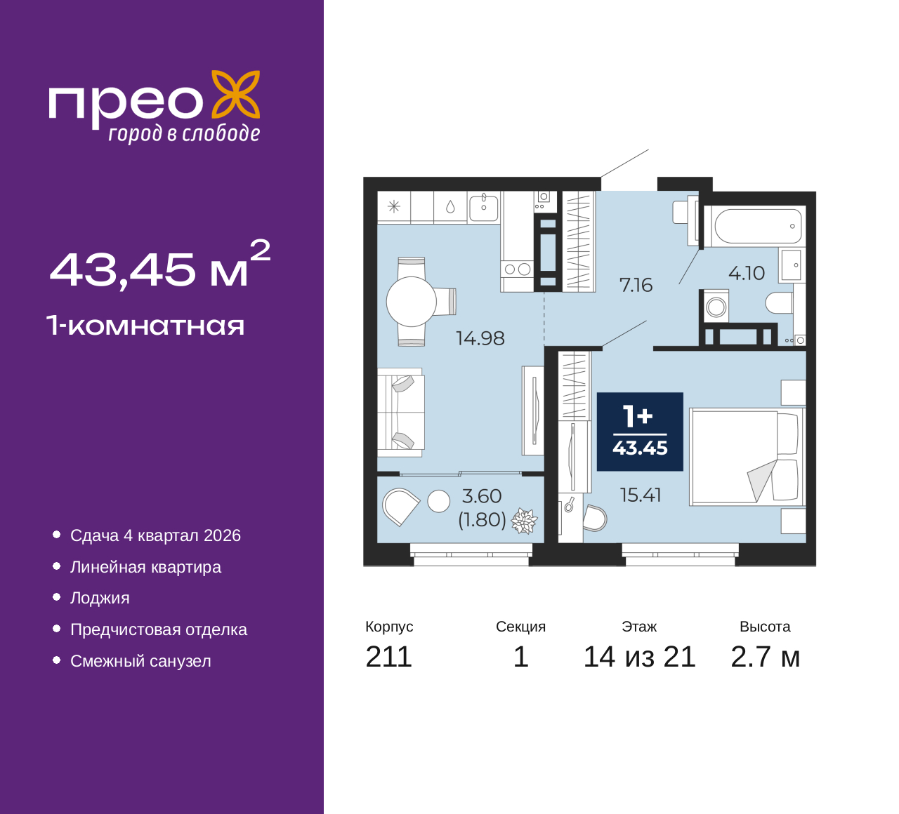 Просторная 1-комн. квартира с предчистовой отделкой в ЖК "Прео" на 14 этаже. Общая площадь: 43.45 кв.м., жилая: 15.41 кв.м., площадь просторной кухни-столовой: 14.98 кв.м. Все окна выходят на одну сторону. В квартире одна лоджия, один совмещенный санузел. Высота потолков 2.7 м. Дом монолитный, черырехподъездный, переменной этажности, от 14 до 21 этажей. Квартира находится в 1-й секции высотой 21 этаж в корпусе 211. На этаже 8 квартир. В подъезде 1 пассажирский и 1 грузовой лифт. Окончание строительства - 4 квартал 2026 года. Оформление сделки по договору долевого участия. Преображенский — один из самых привлекательных районов для жизни! Это полностью самостоятельный жилой район с точки зрения инфраструктуры. Преображенский находится между Московским и Червишевским трактами в квартале улиц Закалужская — Вьюжная — Александра Протозанова. Не нужно ждать, когда появится инфраструктура — переезжайте на всё готовое. Вблизи расположены действующие школа и детский сад. В этом году откроется еще один сад, а в следующем году — школа. По соседству с Преображенским запланировано строительство городского парка «Комарово» площадью 38 гектар. За 10 минут можно доехать на автомобиле до крупных ТРЦ: «Лента», «Кристалл», «Леруа Мерлен», «Метро» и «Ашан». С 2018 года в районе открыт Соседский центр — пространство, созданное для формирования добрососедской среды, совместного досуга, общения и реализации соседских инициатив. Здесь проходят встречи соседей, а также сами жители района организовывают мероприятия. Организатором такого события может стать любой желающий. В квартирах выполнена качественная предчистовая отделка. Гладкие стены с финишным выравниванием по маякам. Ровный потолок для установки натяжного потолка. Установлены пятикамерные окна с двойным стеклопакетом (3 стекла). Дизайнерские холлы с видеонаблюдением, безбарьерным и прозрачным входом – всегда светло и спокойно. На первом этаже есть просторные колясочные, где все жители могут оставлять свои коляски и велосипеды. В Преображенском есть всё, что нужно для активного отдыха и занятий спортом. Мы сделали большое футбольное поле с безопасным покрытием. Также установили хоккейный корт, который оборудован по всем необходимым стандартам. Во дворах можно делать упражнения на специальных площадках с турниками. Весь район мы обустроили велодорожками, которые связаны в единый маршрут. У нас есть сухие фонтаны, бьющие из земли, деревья, веревки, сетки, скалодром, газон, песок и резинка — осталось просто дать своему ребенку право на свободную игру. По-настоящему хорошие дворы — это те, которые дети предпочитают соцсетям и телевизору. Аккредитация в банках: ПАО «Газпромбанк», ПАО Банк «ВТБ», «Сбербанк России», ПАО «Банк Уралсиб», ОАО «Альфа-Банк» и других. (AQID02427579)