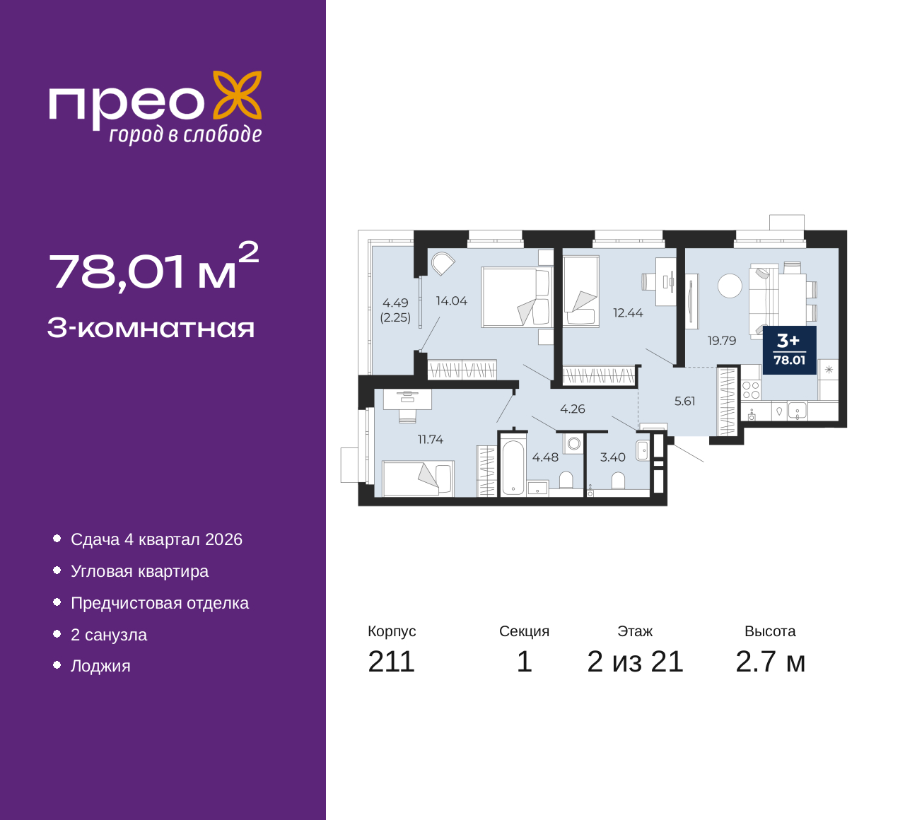 Трехкомнатная квартира от застройщика с предчистовой отделкой в ЖК "Прео" на 2 этаже. Общая площадь: 78.01 кв.м., жилая: 38.22 кв.м., площадь просторной кухни-столовой: 19.79 кв.м. Квартира угловая, идеально подойдет любителям тишины и панорамных видов. В квартире одна лоджия, один совмещенный и один раздельный санузел. Высота потолков 2.7 м. Дом монолитный, черырехподъездный, переменной этажности, от 14 до 21 этажей. Квартира находится в 1-й секции высотой 21 этаж в корпусе 211. На этаже 8 квартир. В подъезде 1 пассажирский и 1 грузовой лифт. Окончание строительства - 4 квартал 2026 года. Оформление сделки по договору долевого участия. Преображенский — один из самых привлекательных районов для жизни! Это полностью самостоятельный жилой район с точки зрения инфраструктуры. Преображенский находится между Московским и Червишевским трактами в квартале улиц Закалужская — Вьюжная — Александра Протозанова. Не нужно ждать, когда появится инфраструктура — переезжайте на всё готовое. Вблизи расположены действующие школа и детский сад. В этом году откроется еще один сад, а в следующем году — школа. По соседству с Преображенским запланировано строительство городского парка «Комарово» площадью 38 гектар. За 10 минут можно доехать на автомобиле до крупных ТРЦ: «Лента», «Кристалл», «Леруа Мерлен», «Метро» и «Ашан». С 2018 года в районе открыт Соседский центр — пространство, созданное для формирования добрососедской среды, совместного досуга, общения и реализации соседских инициатив. Здесь проходят встречи соседей, а также сами жители района организовывают мероприятия. Организатором такого события может стать любой желающий. В квартирах выполнена качественная предчистовая отделка. Гладкие стены с финишным выравниванием по маякам. Ровный потолок для установки натяжного потолка. Установлены пятикамерные окна с двойным стеклопакетом (3 стекла). Дизайнерские холлы с видеонаблюдением, безбарьерным и прозрачным входом – всегда светло и спокойно. На первом этаже есть просторные колясочные, где все жители могут оставлять свои коляски и велосипеды. В Преображенском есть всё, что нужно для активного отдыха и занятий спортом. Мы сделали большое футбольное поле с безопасным покрытием. Также установили хоккейный корт, который оборудован по всем необходимым стандартам. Во дворах можно делать упражнения на специальных площадках с турниками. Весь район мы обустроили велодорожками, которые связаны в единый маршрут. У нас есть сухие фонтаны, бьющие из земли, деревья, веревки, сетки, скалодром, газон, песок и резинка — осталось просто дать своему ребенку право на свободную игру. По-настоящему хорошие дворы — это те, которые дети предпочитают соцсетям и телевизору. Аккредитация в банках: ОАО «Альфа-Банк», ПАО «Газпромбанк», ПАО Банк «ВТБ», «Сбербанк России», ПАО «Банк Уралсиб» и других. (AQID02427719)