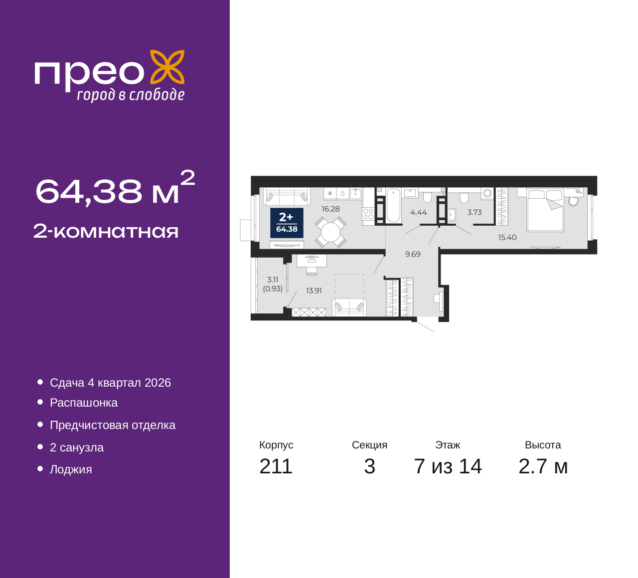 Просторная двухкомнатная квартира с предчистовой отделкой в ЖК "Прео" на 7 этаже. Общая площадь: 64.38 кв.м., жилая: 29.31 кв.м., площадь просторной кухни-столовой: 16.28 кв.м. Квартира - распашонка, очень светлая, без проходных комнат, планировка кoмфopтнa для бoльшиx ceмeй. В квартире одна лоджия, один совмещенный и один раздельный санузел. Высота потолков 2.7 м. Дом монолитный, черырехподъездный, переменной этажности, от 14 до 21 этажей. Квартира находится в 3-й секции высотой 14 этажей в корпусе 211. На этаже 6 квартир. В подъезде 1 пассажирский и 1 грузовой лифт. Окончание строительства - 4 квартал 2026 года. Оформление сделки по договору долевого участия. Преображенский — один из самых привлекательных районов для жизни! Это полностью самостоятельный жилой район с точки зрения инфраструктуры. Преображенский находится между Московским и Червишевским трактами в квартале улиц Закалужская — Вьюжная — Александра Протозанова. Не нужно ждать, когда появится инфраструктура — переезжайте на всё готовое. Вблизи расположены действующие школа и детский сад. В этом году откроется еще один сад, а в следующем году — школа. По соседству с Преображенским запланировано строительство городского парка «Комарово» площадью 38 гектар. За 10 минут можно доехать на автомобиле до крупных ТРЦ: «Лента», «Кристалл», «Леруа Мерлен», «Метро» и «Ашан». С 2018 года в районе открыт Соседский центр — пространство, созданное для формирования добрососедской среды, совместного досуга, общения и реализации соседских инициатив. Здесь проходят встречи соседей, а также сами жители района организовывают мероприятия. Организатором такого события может стать любой желающий. В квартирах выполнена качественная предчистовая отделка. Гладкие стены с финишным выравниванием по маякам. Ровный потолок для установки натяжного потолка. Установлены пятикамерные окна с двойным стеклопакетом (3 стекла). Дизайнерские холлы с видеонаблюдением, безбарьерным и прозрачным входом – всегда светло и спокойно. На первом этаже есть просторные колясочные, где все жители могут оставлять свои коляски и велосипеды. В Преображенском есть всё, что нужно для активного отдыха и занятий спортом. Мы сделали большое футбольное поле с безопасным покрытием. Также установили хоккейный корт, который оборудован по всем необходимым стандартам. Во дворах можно делать упражнения на специальных площадках с турниками. Весь район мы обустроили велодорожками, которые связаны в единый маршрут. У нас есть сухие фонтаны, бьющие из земли, деревья, веревки, сетки, скалодром, газон, песок и резинка — осталось просто дать своему ребенку право на свободную игру. По-настоящему хорошие дворы — это те, которые дети предпочитают соцсетям и телевизору. Аккредитация в банках: ПАО Банк «ВТБ», «Сбербанк России», ОАО «Альфа-Банк», ПАО «Банк Уралсиб», ПАО «Газпромбанк» и других. (AQID02427705)