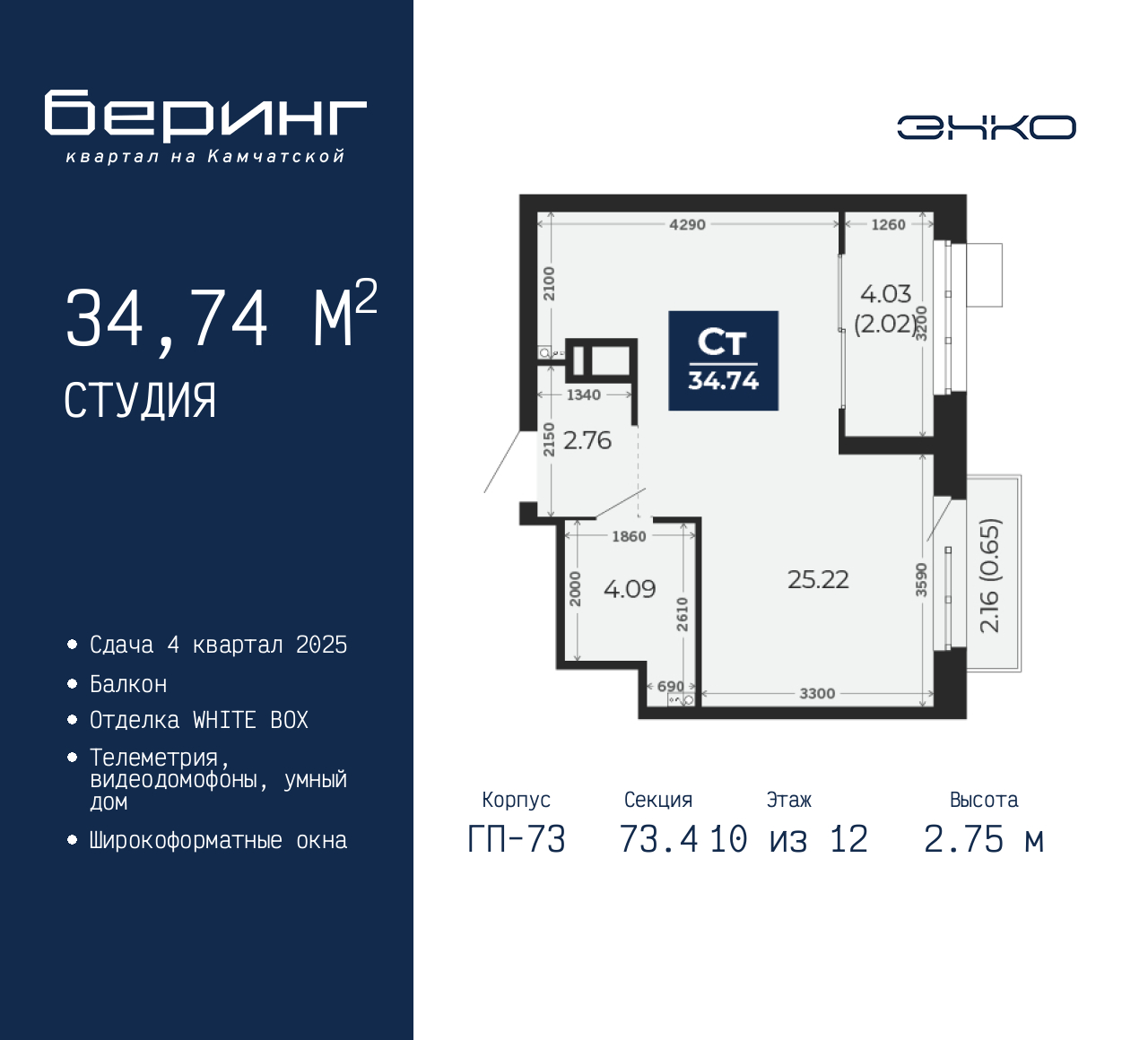 1-комн. квартира-студия от застройщика в ЖК "Беринг" на 10 этаже. Квартира без отделки, новый владелец может сделать ремонт по своему дизайн-проекту. Общая площадь: 34.74 кв.м., площадь гостиной 25.22 кв.м., из которых 5 кв.м. выделено под кухонную зону. Все окна выходят на одну сторону. В квартире один балкон, один совмещенный санузел. Высота потолков 2.75 м. Дом монолитный, многоподъездный, переменной этажности, от 9 до 22 этажей. Квартира находится в 73.4-й секции высотой 12 этажей в корпусе ГП-73. На этаже 8 квартир. В подъезде 1 пассажирский и 1 грузовой лифт. Окончание строительства - 4 квартал 2025 года. Оформление сделки по договору долевого участия. Подобно знаменитому исследователю, мы чувствуем себя первооткрывателями этой локации. Хотим показать новую суть места, сформировать для вас жизненный опыт, которого ещё не было. Беринг — район зелёного цвета. Беринг — район, который откроется вам с другой стороны. Впечатлит новым уровнем комфорта и качеством жизни. Беринг — открытие на карте города. Первый квартал расположен в районе Тура, в границах улиц: Камчатская – Западносибирская – Энтузиастов. Вокруг уже есть всё для того, чтобы ежедневная рутина была лишь частью жизни и не доставляла дискомфорта. Школы и детские сады, магазины и аптеки, поликлиника, места для семейного отдыха, пеших и велопрогулок, и даже рыбалки. Масштабное озеленение дворов — визитная карточка ЭНКО и ваш оазис спокойствия, чтобы отвлечься от повседневности. Раскидистые деревья, кустарники, травы и цветы — осталось остановиться, вдохнуть и расслабиться, глядя на эту природную красоту. Стилистика подъездов продолжает концепцию Беринга, вдохновлённого Камчаткой: сдержанный, но при этом впечатляющий дизайн соседствует с удобством и функциональностью. (AQID02315524)