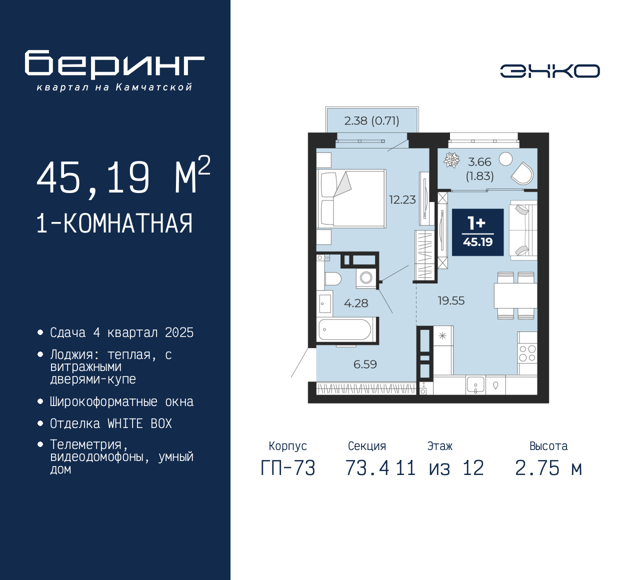 1-комн. квартира в ЖК "Беринг" на 11 этаже. Квартира без отделки, после оформления собственности можно делать ремонт. Общая площадь: 45.19 кв.м., жилая: 12.23 кв.м., площадь просторной кухни-столовой: 19.55 кв.м. Все окна выходят на одну сторону. В квартире один балкон и одна лоджия, один совмещенный санузел. Высота потолков 2.75 м. Дом монолитный, многоподъездный, переменной этажности, от 9 до 22 этажей. Квартира находится в 73.4-й секции высотой 12 этажей в корпусе ГП-73. На этаже 8 квартир. В подъезде 1 пассажирский и 1 грузовой лифт. Окончание строительства - 4 квартал 2025 года. Оформление сделки по договору долевого участия. Подобно знаменитому исследователю, мы чувствуем себя первооткрывателями этой локации. Хотим показать новую суть места, сформировать для вас жизненный опыт, которого ещё не было. Беринг — район зелёного цвета. Беринг — район, который откроется вам с другой стороны. Впечатлит новым уровнем комфорта и качеством жизни. Беринг — открытие на карте города. Первый квартал расположен в районе Тура, в границах улиц: Камчатская – Западносибирская – Энтузиастов. Вокруг уже есть всё для того, чтобы ежедневная рутина была лишь частью жизни и не доставляла дискомфорта. Школы и детские сады, магазины и аптеки, поликлиника, места для семейного отдыха, пеших и велопрогулок, и даже рыбалки. Масштабное озеленение дворов — визитная карточка ЭНКО и ваш оазис спокойствия, чтобы отвлечься от повседневности. Раскидистые деревья, кустарники, травы и цветы — осталось остановиться, вдохнуть и расслабиться, глядя на эту природную красоту. Стилистика подъездов продолжает концепцию Беринга, вдохновлённого Камчаткой: сдержанный, но при этом впечатляющий дизайн соседствует с удобством и функциональностью. (AQID02391845)