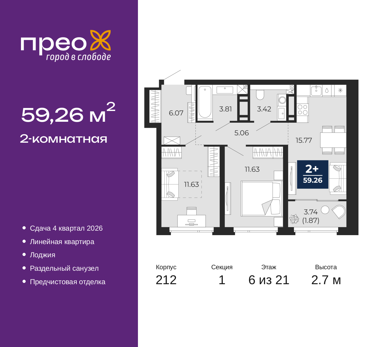 Продается 2-комн. квартира с предчистовой отделкой в ЖК "Прео" на 6 этаже. Общая площадь: 59.26 кв.м., жилая: 23.26 кв.м., площадь просторной кухни-столовой: 15.77 кв.м. Комнаты изолированные, все окна выходят на одну сторону. В квартире одна лоджия, один раздельный санузел. Высота потолков 2.7 м. Квартира находится в корпусе 212. Дом монолитный, одноподъездный, высотой 21 этаж. На этаже 8 квартир. В подъезде 2 пассажирских и 1 грузовой лифт. Окончание строительства - 4 квартал 2026 года. Оформление сделки по договору долевого участия. Преображенский — один из самых привлекательных районов для жизни! Это полностью самостоятельный жилой район с точки зрения инфраструктуры. Преображенский находится между Московским и Червишевским трактами в квартале улиц Закалужская — Вьюжная — Александра Протозанова. Не нужно ждать, когда появится инфраструктура — переезжайте на всё готовое. Вблизи расположены действующие школа и детский сад. В этом году откроется еще один сад, а в следующем году — школа. По соседству с Преображенским запланировано строительство городского парка «Комарово» площадью 38 гектар. За 10 минут можно доехать на автомобиле до крупных ТРЦ: «Лента», «Кристалл», «Леруа Мерлен», «Метро» и «Ашан». С 2018 года в районе открыт Соседский центр — пространство, созданное для формирования добрососедской среды, совместного досуга, общения и реализации соседских инициатив. Здесь проходят встречи соседей, а также сами жители района организовывают мероприятия. Организатором такого события может стать любой желающий. В квартирах выполнена качественная предчистовая отделка. Гладкие стены с финишным выравниванием по маякам. Ровный потолок для установки натяжного потолка. Установлены пятикамерные окна с двойным стеклопакетом (3 стекла). Дизайнерские холлы с видеонаблюдением, безбарьерным и прозрачным входом – всегда светло и спокойно. На первом этаже есть просторные колясочные, где все жители могут оставлять свои коляски и велосипеды. В Преображенском есть всё, что нужно для активного отдыха и занятий спортом. Мы сделали большое футбольное поле с безопасным покрытием. Также установили хоккейный корт, который оборудован по всем необходимым стандартам. Во дворах можно делать упражнения на специальных площадках с турниками. Весь район мы обустроили велодорожками, которые связаны в единый маршрут. У нас есть сухие фонтаны, бьющие из земли, деревья, веревки, сетки, скалодром, газон, песок и резинка — осталось просто дать своему ребенку право на свободную игру. По-настоящему хорошие дворы — это те, которые дети предпочитают соцсетям и телевизору. Аккредитация в банках: ОАО «Альфа-Банк», «Сбербанк России», ПАО «Газпромбанк», ПАО «Банк Уралсиб», ПАО Банк «ВТБ» и других. (AQID02427636)