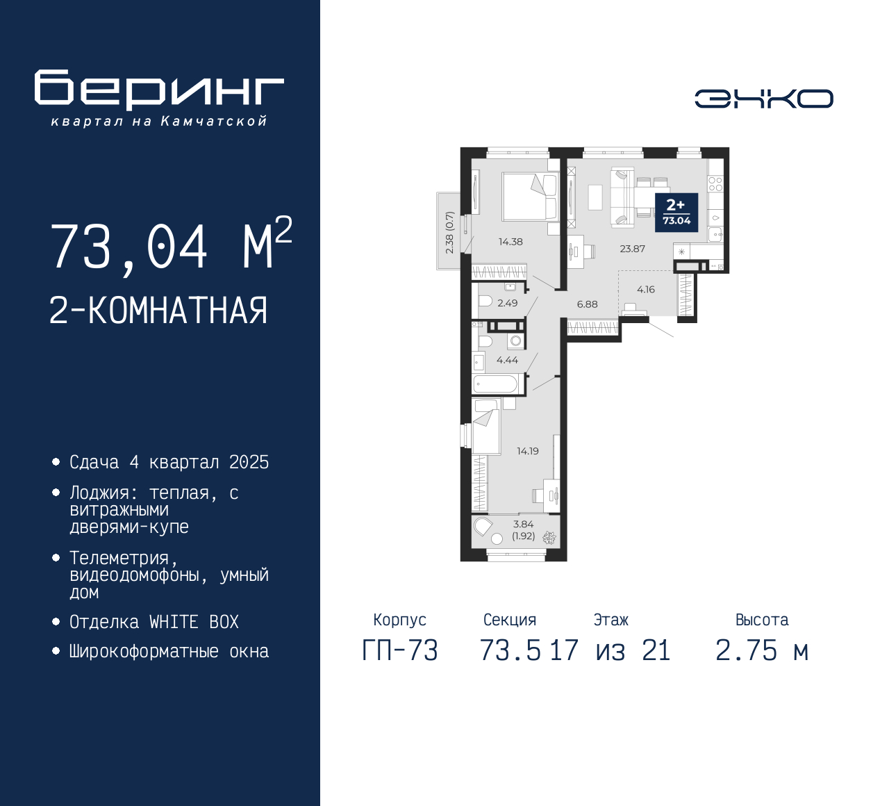 - Общая площадь 73.04 м²