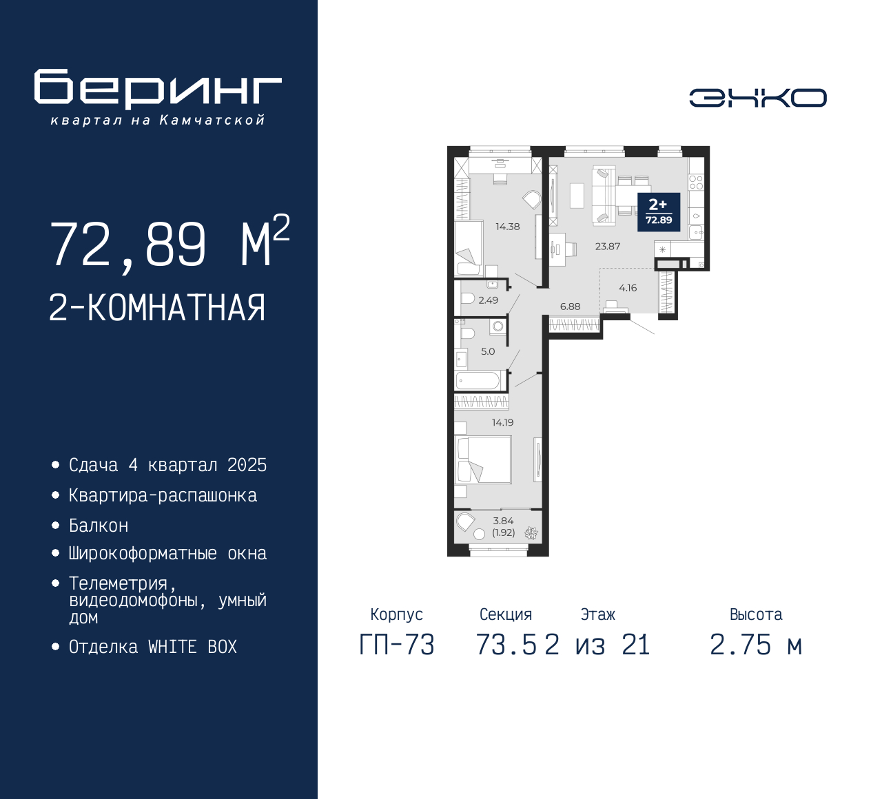 Просторная 2-комн. квартира в ЖК "Беринг" на 2 этаже. Квартира без отделки, новый владелец может сделать ремонт по индивидуальному дизайн-проекту. Общая площадь: 72.89 кв.м., жилая: 28.57 кв.м., площадь просторной кухни-столовой: 23.87 кв.м. Квартира - распашонка, без проходных комнат, окна выходят на paзные стороны дома. В квартире один балкон, один совмещенный и один раздельный санузел. Высота потолков 2.75 м. Дом монолитный, многоподъездный, переменной этажности, от 9 до 22 этажей. Квартира находится в 73.5-й секции высотой 21 этаж в корпусе ГП-73. На этаже 6 квартир. В подъезде 1 пассажирский и 1 грузовой лифт. Окончание строительства - 4 квартал 2025 года. Оформление сделки по договору долевого участия. Подобно знаменитому исследователю, мы чувствуем себя первооткрывателями этой локации. Хотим показать новую суть места, сформировать для вас жизненный опыт, которого ещё не было. Беринг — район зелёного цвета. Беринг — район, который откроется вам с другой стороны. Впечатлит новым уровнем комфорта и качеством жизни. Беринг — открытие на карте города. Первый квартал расположен в районе Тура, в границах улиц: Камчатская – Западносибирская – Энтузиастов. Вокруг уже есть всё для того, чтобы ежедневная рутина была лишь частью жизни и не доставляла дискомфорта. Школы и детские сады, магазины и аптеки, поликлиника, места для семейного отдыха, пеших и велопрогулок, и даже рыбалки. Масштабное озеленение дворов — визитная карточка ЭНКО и ваш оазис спокойствия, чтобы отвлечься от повседневности. Раскидистые деревья, кустарники, травы и цветы — осталось остановиться, вдохнуть и расслабиться, глядя на эту природную красоту. Стилистика подъездов продолжает концепцию Беринга, вдохновлённого Камчаткой: сдержанный, но при этом впечатляющий дизайн соседствует с удобством и функциональностью. (AQID02316190)