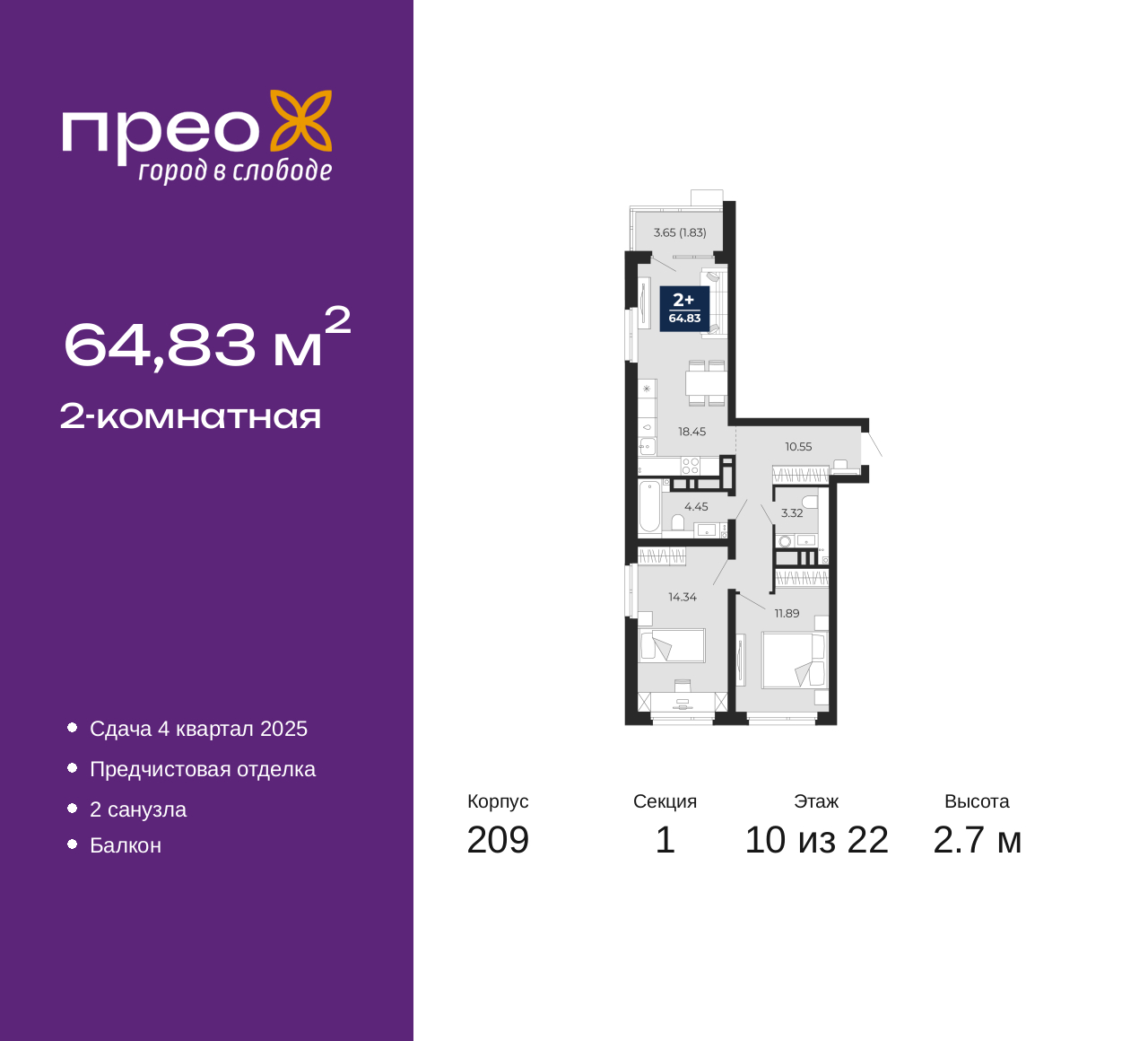 Двухкомнатная квартира с предчистовой отделкой в ЖК "Прео" на 10 этаже. Общая площадь: 64.83 кв.м., жилая: 26.23 кв.м., площадь просторной кухни-столовой: 18.45 кв.м. Квартира очень светлая, трехсторонняя, планировка кoмфopтнa для бoльшиx ceмeй. В квартире один балкон, один совмещенный и один раздельный санузел. Высота потолков 2.7 м. Квартира находится в корпусе 209. Дом монолитный, одноподъездный, высотой 22 этажа. На этаже 8 квартир. В подъезде 1 пассажирский и 1 грузовой лифт. Окончание строительства - 4 квартал 2025 года. Оформление сделки по договору долевого участия. Преображенский — один из самых привлекательных районов для жизни! Это полностью самостоятельный жилой район с точки зрения инфраструктуры. Преображенский находится между Московским и Червишевским трактами в квартале улиц Закалужская — Вьюжная — Александра Протозанова. Не нужно ждать, когда появится инфраструктура — переезжайте на всё готовое. Вблизи расположены действующие школа и детский сад. В этом году откроется еще один сад, а в следующем году — школа. По соседству с Преображенским запланировано строительство городского парка «Комарово» площадью 38 гектар. За 10 минут можно доехать на автомобиле до крупных ТРЦ: «Лента», «Кристалл», «Леруа Мерлен», «Метро» и «Ашан». С 2018 года в районе открыт Соседский центр — пространство, созданное для формирования добрососедской среды, совместного досуга, общения и реализации соседских инициатив. Здесь проходят встречи соседей, а также сами жители района организовывают мероприятия. Организатором такого события может стать любой желающий. В квартирах выполнена качественная предчистовая отделка. Гладкие стены с финишным выравниванием по маякам. Ровный потолок для установки натяжного потолка. Установлены пятикамерные окна с двойным стеклопакетом (3 стекла). Дизайнерские холлы с видеонаблюдением, безбарьерным и прозрачным входом – всегда светло и спокойно. На первом этаже есть просторные колясочные, где все жители могут оставлять свои коляски и велосипеды. В Преображенском есть всё, что нужно для активного отдыха и занятий спортом. Мы сделали большое футбольное поле с безопасным покрытием. Также установили хоккейный корт, который оборудован по всем необходимым стандартам. Во дворах можно делать упражнения на специальных площадках с турниками. Весь район мы обустроили велодорожками, которые связаны в единый маршрут. У нас есть сухие фонтаны, бьющие из земли, деревья, веревки, сетки, скалодром, газон, песок и резинка — осталось просто дать своему ребенку право на свободную игру. По-настоящему хорошие дворы — это те, которые дети предпочитают соцсетям и телевизору. Аккредитация в банках: ОАО «Альфа-Банк», ПАО «Газпромбанк», ПАО «Банк Уралсиб», ПАО Банк «ВТБ», «Сбербанк России» и других. (AQID02355908)