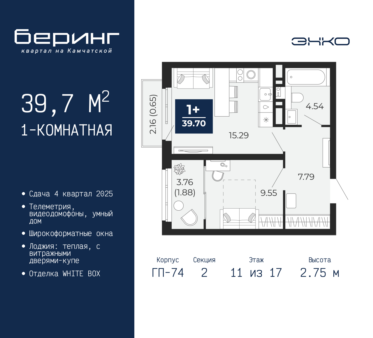 Просторная 1-комн. квартира в ЖК "Беринг" на 11 этаже. Квартира без отделки, после оформления собственности можно делать ремонт. Общая площадь: 39.7 кв.м., жилая: 9.55 кв.м., площадь просторной кухни-столовой: 15.29 кв.м. Все окна выходят на одну сторону. В квартире один балкон и одна лоджия, один совмещенный санузел. Высота потолков 2.75 м. Дом монолитный, многоподъездный, переменной этажности, от 9 до 21 этажей. Квартира находится во 2-й секции высотой 17 этажей в корпусе ГП-74. На этаже 7 квартир. В подъезде 1 пассажирский и 1 грузовой лифт. Окончание строительства - 4 квартал 2025 года. Оформление сделки по договору долевого участия. Подобно знаменитому исследователю, мы чувствуем себя первооткрывателями этой локации. Хотим показать новую суть места, сформировать для вас жизненный опыт, которого ещё не было. Беринг — район зелёного цвета. Беринг — район, который откроется вам с другой стороны. Впечатлит новым уровнем комфорта и качеством жизни. Беринг — открытие на карте города. Первый квартал расположен в районе Тура, в границах улиц: Камчатская – Западносибирская – Энтузиастов. Вокруг уже есть всё для того, чтобы ежедневная рутина была лишь частью жизни и не доставляла дискомфорта. Школы и детские сады, магазины и аптеки, поликлиника, места для семейного отдыха, пеших и велопрогулок, и даже рыбалки. Масштабное озеленение дворов — визитная карточка ЭНКО и ваш оазис спокойствия, чтобы отвлечься от повседневности. Раскидистые деревья, кустарники, травы и цветы — осталось остановиться, вдохнуть и расслабиться, глядя на эту природную красоту. Стилистика подъездов продолжает концепцию Беринга, вдохновлённого Камчаткой: сдержанный, но при этом впечатляющий дизайн соседствует с удобством и функциональностью. (AQID02315758)