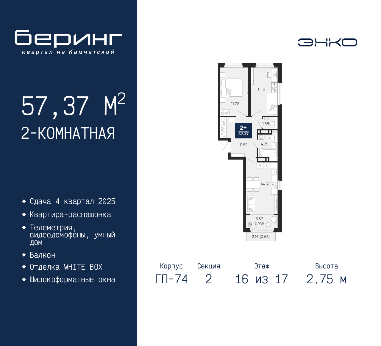 Просторная 2-комн. квартира в ЖК "Беринг" на 16 этаже. Квартира без отделки, новый собственник может сделать ремонт по своему проекту. Общая площадь: 57.37 кв.м., жилая: 22.92 кв.м., площадь просторной кухни-столовой: 14.56 кв.м. Квартира - распашонка, без проходных комнат, окна выходят на paзные стороны дома. В квартире один балкон, один совмещенный и один раздельный санузел. Высота потолков 2.75 м. Дом монолитный, многоподъездный, переменной этажности, от 9 до 21 этажей. Квартира находится во 2-й секции высотой 17 этажей в корпусе ГП-74. На этаже 7 квартир. В подъезде 1 пассажирский и 1 грузовой лифт. Окончание строительства - 4 квартал 2025 года. Оформление сделки по договору долевого участия. Подобно знаменитому исследователю, мы чувствуем себя первооткрывателями этой локации. Хотим показать новую суть места, сформировать для вас жизненный опыт, которого ещё не было. Беринг — район зелёного цвета. Беринг — район, который откроется вам с другой стороны. Впечатлит новым уровнем комфорта и качеством жизни. Беринг — открытие на карте города. Первый квартал расположен в районе Тура, в границах улиц: Камчатская – Западносибирская – Энтузиастов. Вокруг уже есть всё для того, чтобы ежедневная рутина была лишь частью жизни и не доставляла дискомфорта. Школы и детские сады, магазины и аптеки, поликлиника, места для семейного отдыха, пеших и велопрогулок, и даже рыбалки. Масштабное озеленение дворов — визитная карточка ЭНКО и ваш оазис спокойствия, чтобы отвлечься от повседневности. Раскидистые деревья, кустарники, травы и цветы — осталось остановиться, вдохнуть и расслабиться, глядя на эту природную красоту. Стилистика подъездов продолжает концепцию Беринга, вдохновлённого Камчаткой: сдержанный, но при этом впечатляющий дизайн соседствует с удобством и функциональностью. (AQID02316031)