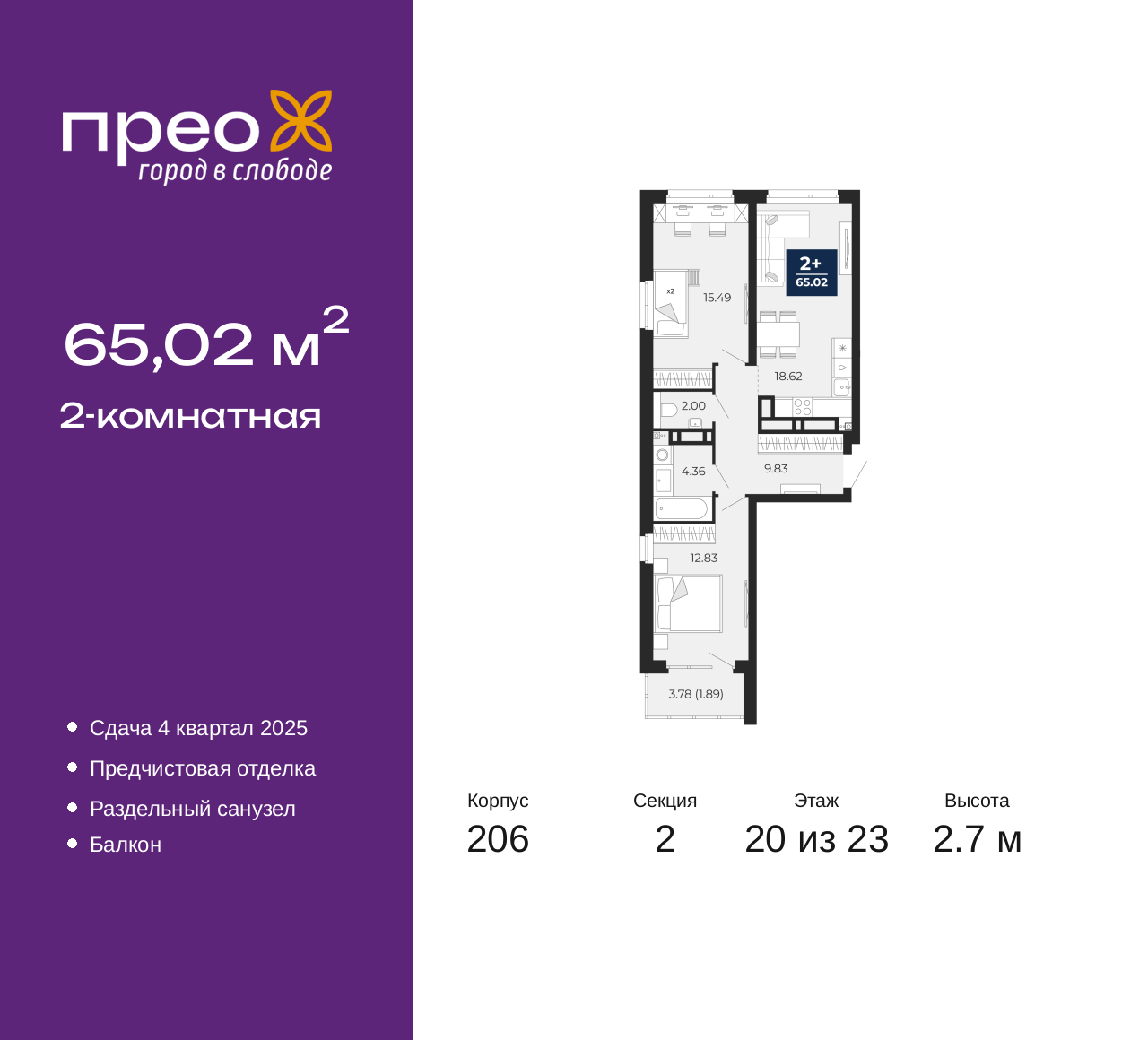 - Общая площадь 65.02 м²