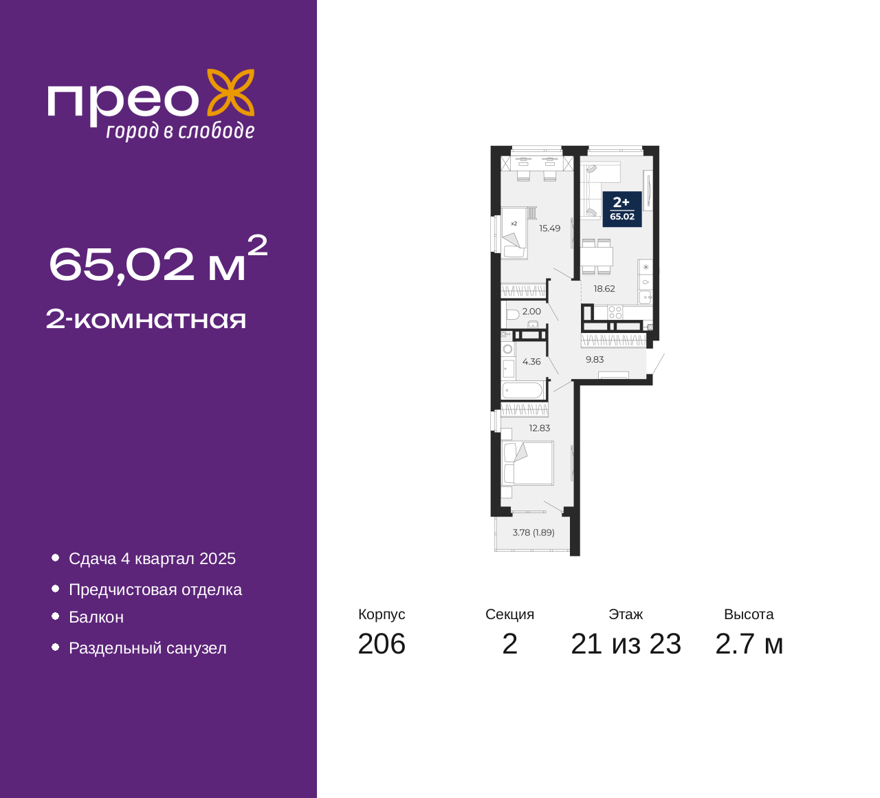 - Общая площадь 65.02 м²