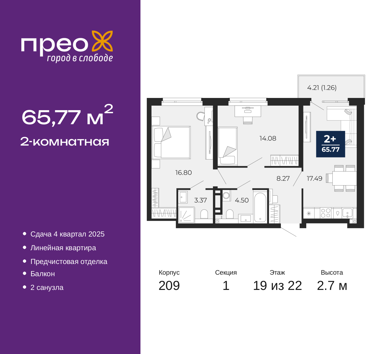 Двухкомнатная квартира от застройщика с предчистовой отделкой в ЖК "Прео" на 19 этаже. Общая площадь: 65.77 кв.м., жилая: 30.88 кв.м., площадь просторной кухни-столовой: 17.49 кв.м. Комнаты изолированные, все окна выходят на одну сторону. В квартире один балкон, два совмещенных санузла. Высота потолков 2.7 м. Квартира находится в корпусе 209. Дом монолитный, одноподъездный, высотой 22 этажа. На этаже 8 квартир. В подъезде 1 пассажирский и 1 грузовой лифт. Окончание строительства - 4 квартал 2025 года. Оформление сделки по договору долевого участия. Преображенский — один из самых привлекательных районов для жизни! Это полностью самостоятельный жилой район с точки зрения инфраструктуры. Преображенский находится между Московским и Червишевским трактами в квартале улиц Закалужская — Вьюжная — Александра Протозанова. Не нужно ждать, когда появится инфраструктура — переезжайте на всё готовое. Вблизи расположены действующие школа и детский сад. В этом году откроется еще один сад, а в следующем году — школа. По соседству с Преображенским запланировано строительство городского парка «Комарово» площадью 38 гектар. За 10 минут можно доехать на автомобиле до крупных ТРЦ: «Лента», «Кристалл», «Леруа Мерлен», «Метро» и «Ашан». С 2018 года в районе открыт Соседский центр — пространство, созданное для формирования добрососедской среды, совместного досуга, общения и реализации соседских инициатив. Здесь проходят встречи соседей, а также сами жители района организовывают мероприятия. Организатором такого события может стать любой желающий. В квартирах выполнена качественная предчистовая отделка. Гладкие стены с финишным выравниванием по маякам. Ровный потолок для установки натяжного потолка. Установлены пятикамерные окна с двойным стеклопакетом (3 стекла). Дизайнерские холлы с видеонаблюдением, безбарьерным и прозрачным входом – всегда светло и спокойно. На первом этаже есть просторные колясочные, где все жители могут оставлять свои коляски и велосипеды. В Преображенском есть всё, что нужно для активного отдыха и занятий спортом. Мы сделали большое футбольное поле с безопасным покрытием. Также установили хоккейный корт, который оборудован по всем необходимым стандартам. Во дворах можно делать упражнения на специальных площадках с турниками. Весь район мы обустроили велодорожками, которые связаны в единый маршрут. У нас есть сухие фонтаны, бьющие из земли, деревья, веревки, сетки, скалодром, газон, песок и резинка — осталось просто дать своему ребенку право на свободную игру. По-настоящему хорошие дворы — это те, которые дети предпочитают соцсетям и телевизору. Аккредитация в банках: ПАО «Газпромбанк», «Сбербанк России», ПАО «Банк Уралсиб», ПАО Банк «ВТБ», ОАО «Альфа-Банк» и других. (AQID02355994)