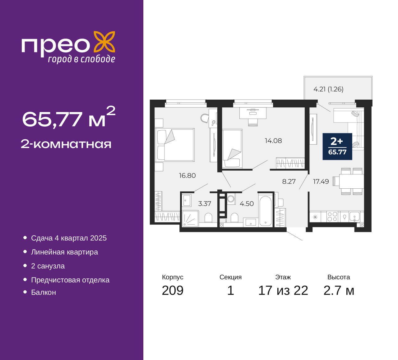 2-комн. квартира с предчистовой отделкой в ЖК "Прео" на 17 этаже. Общая площадь: 65.77 кв.м., жилая: 30.88 кв.м., площадь просторной кухни-столовой: 17.49 кв.м. Комнаты изолированные, все окна выходят на одну сторону. В квартире один балкон, два совмещенных санузла. Высота потолков 2.7 м. Квартира находится в корпусе 209. Дом монолитный, одноподъездный, высотой 22 этажа. На этаже 8 квартир. В подъезде 1 пассажирский и 1 грузовой лифт. Окончание строительства - 4 квартал 2025 года. Оформление сделки по договору долевого участия. Преображенский — один из самых привлекательных районов для жизни! Это полностью самостоятельный жилой район с точки зрения инфраструктуры. Преображенский находится между Московским и Червишевским трактами в квартале улиц Закалужская — Вьюжная — Александра Протозанова. Не нужно ждать, когда появится инфраструктура — переезжайте на всё готовое. Вблизи расположены действующие школа и детский сад. В этом году откроется еще один сад, а в следующем году — школа. По соседству с Преображенским запланировано строительство городского парка «Комарово» площадью 38 гектар. За 10 минут можно доехать на автомобиле до крупных ТРЦ: «Лента», «Кристалл», «Леруа Мерлен», «Метро» и «Ашан». С 2018 года в районе открыт Соседский центр — пространство, созданное для формирования добрососедской среды, совместного досуга, общения и реализации соседских инициатив. Здесь проходят встречи соседей, а также сами жители района организовывают мероприятия. Организатором такого события может стать любой желающий. В квартирах выполнена качественная предчистовая отделка. Гладкие стены с финишным выравниванием по маякам. Ровный потолок для установки натяжного потолка. Установлены пятикамерные окна с двойным стеклопакетом (3 стекла). Дизайнерские холлы с видеонаблюдением, безбарьерным и прозрачным входом – всегда светло и спокойно. На первом этаже есть просторные колясочные, где все жители могут оставлять свои коляски и велосипеды. В Преображенском есть всё, что нужно для активного отдыха и занятий спортом. Мы сделали большое футбольное поле с безопасным покрытием. Также установили хоккейный корт, который оборудован по всем необходимым стандартам. Во дворах можно делать упражнения на специальных площадках с турниками. Весь район мы обустроили велодорожками, которые связаны в единый маршрут. У нас есть сухие фонтаны, бьющие из земли, деревья, веревки, сетки, скалодром, газон, песок и резинка — осталось просто дать своему ребенку право на свободную игру. По-настоящему хорошие дворы — это те, которые дети предпочитают соцсетям и телевизору. Аккредитация в банках: ПАО «Газпромбанк», «Сбербанк России», ПАО «Банк Уралсиб», ОАО «Альфа-Банк», ПАО Банк «ВТБ» и других. (AQID02355980)