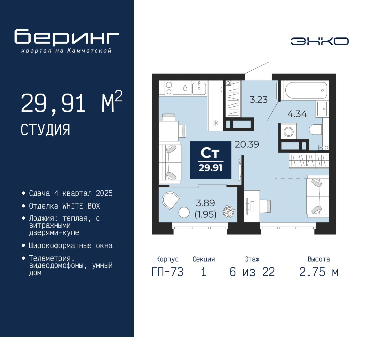 1-комн. квартира-студия от застройщика в ЖК "Беринг" на 6 этаже. Квартира без отделки, полностью готова к ремонту. Общая площадь: 29.91 кв.м., площадь гостиной 20.39 кв.м., из которых 5 кв.м. выделено под кухонную зону. Все окна выходят на одну сторону. В квартире одна лоджия, один совмещенный санузел. Высота потолков 2.75 м. Дом монолитный, многоподъездный, переменной этажности, от 9 до 22 этажей. Квартира находится в 1-й секции высотой 22 этажа в корпусе ГП-73. На этаже 5 квартир. В подъезде 1 пассажирский и 1 грузовой лифт. Окончание строительства - 4 квартал 2025 года. Оформление сделки по договору долевого участия. Подобно знаменитому исследователю, мы чувствуем себя первооткрывателями этой локации. Хотим показать новую суть места, сформировать для вас жизненный опыт, которого ещё не было. Беринг — район зелёного цвета. Беринг — район, который откроется вам с другой стороны. Впечатлит новым уровнем комфорта и качеством жизни. Беринг — открытие на карте города. Первый квартал расположен в районе Тура, в границах улиц: Камчатская – Западносибирская – Энтузиастов. Вокруг уже есть всё для того, чтобы ежедневная рутина была лишь частью жизни и не доставляла дискомфорта. Школы и детские сады, магазины и аптеки, поликлиника, места для семейного отдыха, пеших и велопрогулок, и даже рыбалки. Масштабное озеленение дворов — визитная карточка ЭНКО и ваш оазис спокойствия, чтобы отвлечься от повседневности. Раскидистые деревья, кустарники, травы и цветы — осталось остановиться, вдохнуть и расслабиться, глядя на эту природную красоту. Стилистика подъездов продолжает концепцию Беринга, вдохновлённого Камчаткой: сдержанный, но при этом впечатляющий дизайн соседствует с удобством и функциональностью. (AQID02315438)