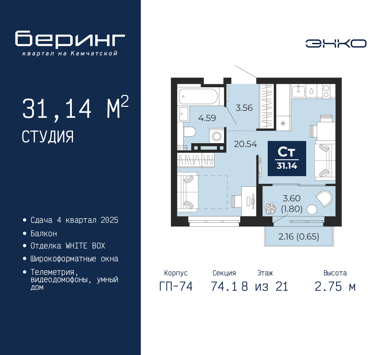 Однокомнатная квартира-студия в ЖК "Беринг" на 8 этаже. Квартира без отделки, после выдачи ключей можно делать ремонт. Общая площадь: 31.14 кв.м., площадь гостиной 20.54 кв.м., из которых 5 кв.м. выделено под кухонную зону. Все окна выходят на одну сторону. В квартире один балкон, один совмещенный санузел. Высота потолков 2.75 м. Дом монолитный, многоподъездный, переменной этажности, от 9 до 21 этажей. Квартира находится в 74.1-й секции высотой 21 этаж в корпусе ГП-74. На этаже 5 квартир. В подъезде 1 грузовой лифт. Окончание строительства - 4 квартал 2025 года. Оформление сделки по договору долевого участия. Подобно знаменитому исследователю, мы чувствуем себя первооткрывателями этой локации. Хотим показать новую суть места, сформировать для вас жизненный опыт, которого ещё не было. Беринг — район зелёного цвета. Беринг — район, который откроется вам с другой стороны. Впечатлит новым уровнем комфорта и качеством жизни. Беринг — открытие на карте города. Первый квартал расположен в районе Тура, в границах улиц: Камчатская – Западносибирская – Энтузиастов. Вокруг уже есть всё для того, чтобы ежедневная рутина была лишь частью жизни и не доставляла дискомфорта. Школы и детские сады, магазины и аптеки, поликлиника, места для семейного отдыха, пеших и велопрогулок, и даже рыбалки. Масштабное озеленение дворов — визитная карточка ЭНКО и ваш оазис спокойствия, чтобы отвлечься от повседневности. Раскидистые деревья, кустарники, травы и цветы — осталось остановиться, вдохнуть и расслабиться, глядя на эту природную красоту. Стилистика подъездов продолжает концепцию Беринга, вдохновлённого Камчаткой: сдержанный, но при этом впечатляющий дизайн соседствует с удобством и функциональностью. (AQID02315549)