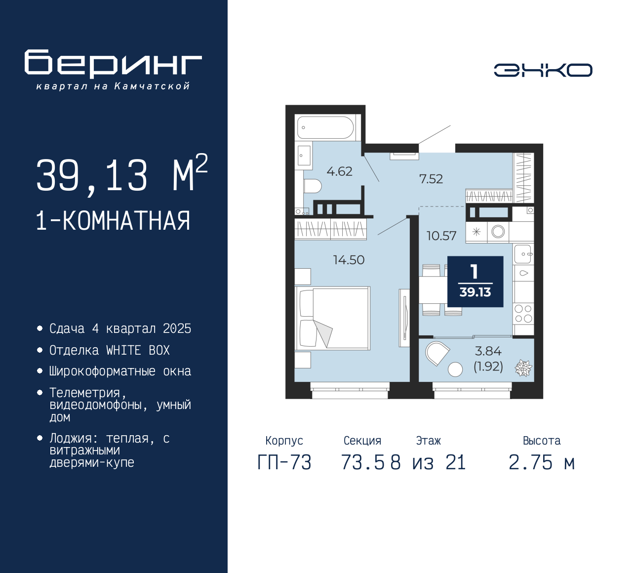 Продается однокомнатная квартира в ЖК "Беринг" на 8 этаже. Квартира без отделки, полностью готова к ремонту. Общая площадь: 39.13 кв.м., жилая: 14.5 кв.м., площадь просторной кухни-столовой: 10.57 кв.м. Все окна выходят на одну сторону. В квартире одна лоджия, один совмещенный санузел. Высота потолков 2.75 м. Дом монолитный, многоподъездный, переменной этажности, от 9 до 22 этажей. Квартира находится в 73.5-й секции высотой 21 этаж в корпусе ГП-73. На этаже 6 квартир. В подъезде 1 пассажирский и 1 грузовой лифт. Окончание строительства - 4 квартал 2025 года. Оформление сделки по договору долевого участия. Подобно знаменитому исследователю, мы чувствуем себя первооткрывателями этой локации. Хотим показать новую суть места, сформировать для вас жизненный опыт, которого ещё не было. Беринг — район зелёного цвета. Беринг — район, который откроется вам с другой стороны. Впечатлит новым уровнем комфорта и качеством жизни. Беринг — открытие на карте города. Первый квартал расположен в районе Тура, в границах улиц: Камчатская – Западносибирская – Энтузиастов. Вокруг уже есть всё для того, чтобы ежедневная рутина была лишь частью жизни и не доставляла дискомфорта. Школы и детские сады, магазины и аптеки, поликлиника, места для семейного отдыха, пеших и велопрогулок, и даже рыбалки. Масштабное озеленение дворов — визитная карточка ЭНКО и ваш оазис спокойствия, чтобы отвлечься от повседневности. Раскидистые деревья, кустарники, травы и цветы — осталось остановиться, вдохнуть и расслабиться, глядя на эту природную красоту. Стилистика подъездов продолжает концепцию Беринга, вдохновлённого Камчаткой: сдержанный, но при этом впечатляющий дизайн соседствует с удобством и функциональностью. (AQID02315654)