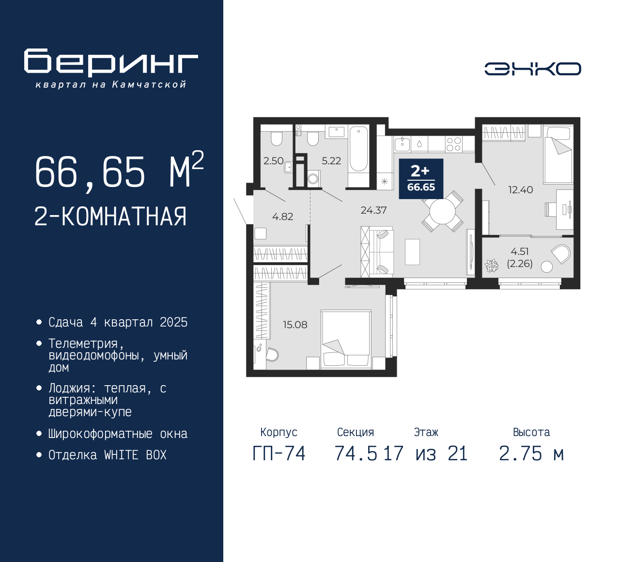 Двухкомнатная квартира от застройщика в ЖК "Беринг" на 17 этаже. Квартира без отделки, после оформления собственности можно делать ремонт. Общая площадь: 66.65 кв.м., жилая: 27.48 кв.м., площадь просторной кухни-столовой: 24.37 кв.м. Квартира угловая, идеально подойдет любителям тишины и панорамных видов. В квартире одна лоджия, один совмещенный и один раздельный санузел. Высота потолков 2.75 м. Дом монолитный, многоподъездный, переменной этажности, от 9 до 21 этажей. Квартира находится в 74.5-й секции высотой 21 этаж в корпусе ГП-74. На этаже 7 квартир. В подъезде 1 пассажирский и 1 грузовой лифт. Окончание строительства - 4 квартал 2025 года. Оформление сделки по договору долевого участия. Подобно знаменитому исследователю, мы чувствуем себя первооткрывателями этой локации. Хотим показать новую суть места, сформировать для вас жизненный опыт, которого ещё не было. Беринг — район зелёного цвета. Беринг — район, который откроется вам с другой стороны. Впечатлит новым уровнем комфорта и качеством жизни. Беринг — открытие на карте города. Первый квартал расположен в районе Тура, в границах улиц: Камчатская – Западносибирская – Энтузиастов. Вокруг уже есть всё для того, чтобы ежедневная рутина была лишь частью жизни и не доставляла дискомфорта. Школы и детские сады, магазины и аптеки, поликлиника, места для семейного отдыха, пеших и велопрогулок, и даже рыбалки. Масштабное озеленение дворов — визитная карточка ЭНКО и ваш оазис спокойствия, чтобы отвлечься от повседневности. Раскидистые деревья, кустарники, травы и цветы — осталось остановиться, вдохнуть и расслабиться, глядя на эту природную красоту. Стилистика подъездов продолжает концепцию Беринга, вдохновлённого Камчаткой: сдержанный, но при этом впечатляющий дизайн соседствует с удобством и функциональностью. (AQID02316158)