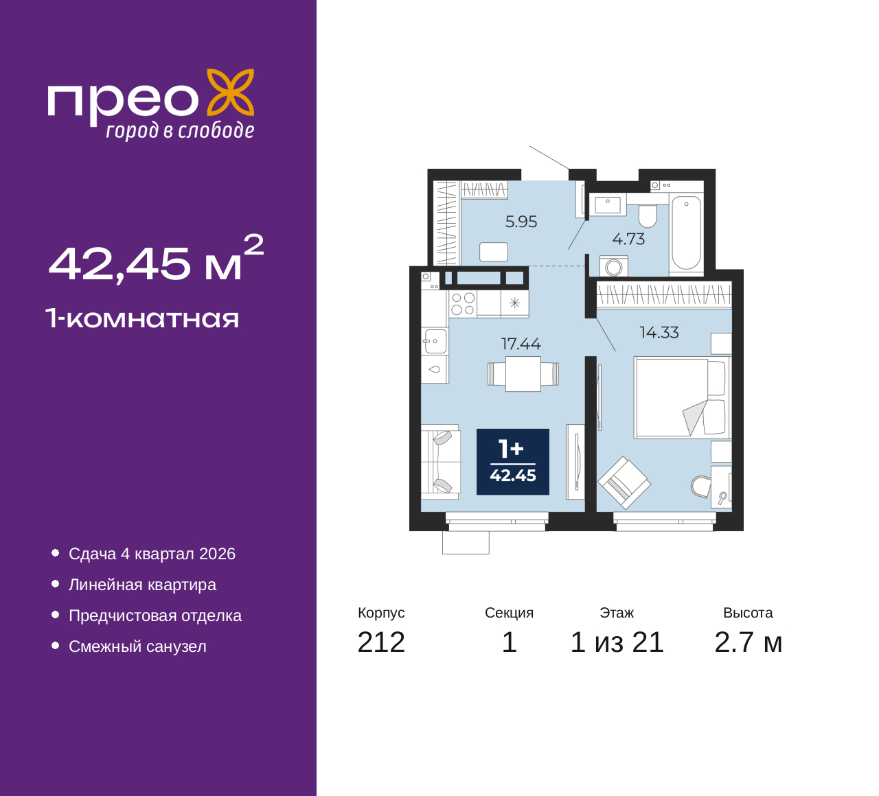 Однокомнатная квартира с предчистовой отделкой в ЖК "Прео" на 1 этаже. Общая площадь: 42.45 кв.м., жилая: 14.33 кв.м., площадь просторной кухни-столовой: 17.44 кв.м. Все окна выходят на одну сторону. В квартире один совмещенный санузел. Высота потолков 2.7 м. Квартира находится в корпусе 212. Дом монолитный, одноподъездный, высотой 21 этаж. На этаже 8 квартир. В подъезде 2 пассажирских и 1 грузовой лифт. Окончание строительства - 4 квартал 2026 года. Оформление сделки по договору долевого участия. Преображенский — один из самых привлекательных районов для жизни! Это полностью самостоятельный жилой район с точки зрения инфраструктуры. Преображенский находится между Московским и Червишевским трактами в квартале улиц Закалужская — Вьюжная — Александра Протозанова. Не нужно ждать, когда появится инфраструктура — переезжайте на всё готовое. Вблизи расположены действующие школа и детский сад. В этом году откроется еще один сад, а в следующем году — школа. По соседству с Преображенским запланировано строительство городского парка «Комарово» площадью 38 гектар. За 10 минут можно доехать на автомобиле до крупных ТРЦ: «Лента», «Кристалл», «Леруа Мерлен», «Метро» и «Ашан». С 2018 года в районе открыт Соседский центр — пространство, созданное для формирования добрососедской среды, совместного досуга, общения и реализации соседских инициатив. Здесь проходят встречи соседей, а также сами жители района организовывают мероприятия. Организатором такого события может стать любой желающий. В квартирах выполнена качественная предчистовая отделка. Гладкие стены с финишным выравниванием по маякам. Ровный потолок для установки натяжного потолка. Установлены пятикамерные окна с двойным стеклопакетом (3 стекла). Дизайнерские холлы с видеонаблюдением, безбарьерным и прозрачным входом – всегда светло и спокойно. На первом этаже есть просторные колясочные, где все жители могут оставлять свои коляски и велосипеды. В Преображенском есть всё, что нужно для активного отдыха и занятий спортом. Мы сделали большое футбольное поле с безопасным покрытием. Также установили хоккейный корт, который оборудован по всем необходимым стандартам. Во дворах можно делать упражнения на специальных площадках с турниками. Весь район мы обустроили велодорожками, которые связаны в единый маршрут. У нас есть сухие фонтаны, бьющие из земли, деревья, веревки, сетки, скалодром, газон, песок и резинка — осталось просто дать своему ребенку право на свободную игру. По-настоящему хорошие дворы — это те, которые дети предпочитают соцсетям и телевизору. Аккредитация в банках: ОАО «Альфа-Банк», «Сбербанк России», ПАО «Газпромбанк», ПАО Банк «ВТБ», ПАО «Банк Уралсиб» и других. (AQID02427529)