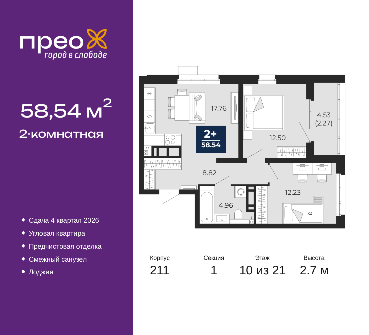 Двухкомнатная квартира с предчистовой отделкой в ЖК "Прео" на 10 этаже. Общая площадь: 58.54 кв.м., жилая: 24.73 кв.м., площадь просторной кухни-столовой: 17.76 кв.м. Угловая квартира, окна oбecпeчивaют paвнoмepнoe ocвeщeниe в тeчeниe дня. В квартире одна лоджия, один совмещенный санузел. Высота потолков 2.7 м. Дом монолитный, черырехподъездный, переменной этажности, от 14 до 21 этажей. Квартира находится в 1-й секции высотой 21 этаж в корпусе 211. На этаже 8 квартир. В подъезде 1 пассажирский и 1 грузовой лифт. Окончание строительства - 4 квартал 2026 года. Оформление сделки по договору долевого участия. Преображенский — один из самых привлекательных районов для жизни! Это полностью самостоятельный жилой район с точки зрения инфраструктуры. Преображенский находится между Московским и Червишевским трактами в квартале улиц Закалужская — Вьюжная — Александра Протозанова. Не нужно ждать, когда появится инфраструктура — переезжайте на всё готовое. Вблизи расположены действующие школа и детский сад. В этом году откроется еще один сад, а в следующем году — школа. По соседству с Преображенским запланировано строительство городского парка «Комарово» площадью 38 гектар. За 10 минут можно доехать на автомобиле до крупных ТРЦ: «Лента», «Кристалл», «Леруа Мерлен», «Метро» и «Ашан». С 2018 года в районе открыт Соседский центр — пространство, созданное для формирования добрососедской среды, совместного досуга, общения и реализации соседских инициатив. Здесь проходят встречи соседей, а также сами жители района организовывают мероприятия. Организатором такого события может стать любой желающий. В квартирах выполнена качественная предчистовая отделка. Гладкие стены с финишным выравниванием по маякам. Ровный потолок для установки натяжного потолка. Установлены пятикамерные окна с двойным стеклопакетом (3 стекла). Дизайнерские холлы с видеонаблюдением, безбарьерным и прозрачным входом – всегда светло и спокойно. На первом этаже есть просторные колясочные, где все жители могут оставлять свои коляски и велосипеды. В Преображенском есть всё, что нужно для активного отдыха и занятий спортом. Мы сделали большое футбольное поле с безопасным покрытием. Также установили хоккейный корт, который оборудован по всем необходимым стандартам. Во дворах можно делать упражнения на специальных площадках с турниками. Весь район мы обустроили велодорожками, которые связаны в единый маршрут. У нас есть сухие фонтаны, бьющие из земли, деревья, веревки, сетки, скалодром, газон, песок и резинка — осталось просто дать своему ребенку право на свободную игру. По-настоящему хорошие дворы — это те, которые дети предпочитают соцсетям и телевизору. Аккредитация в банках: ПАО Банк «ВТБ», ПАО «Газпромбанк», «Сбербанк России», ПАО «Банк Уралсиб», ОАО «Альфа-Банк» и других. (AQID02427647)